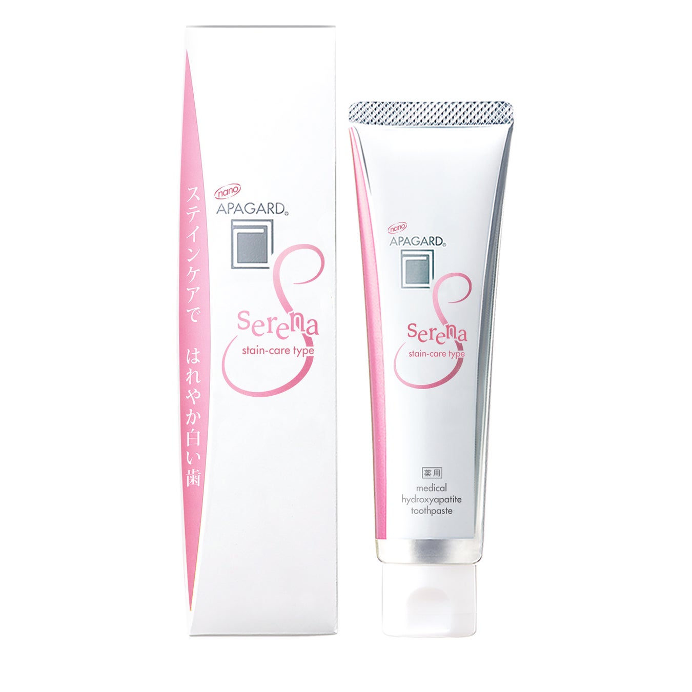 アパガードは、歯とほぼ同じ成分*2である「ハイドロキシアパタイト」を歯みがき剤に配合するという“歯に成分を与える”足し算の発想から誕生しました。サンギの歯みがき剤には、むし歯予防の有効成分「薬用ハイドロキシアパタイト」が配合されており、「アパガードセレナ」ではさらに2種のステインケア成分*3を加えています。