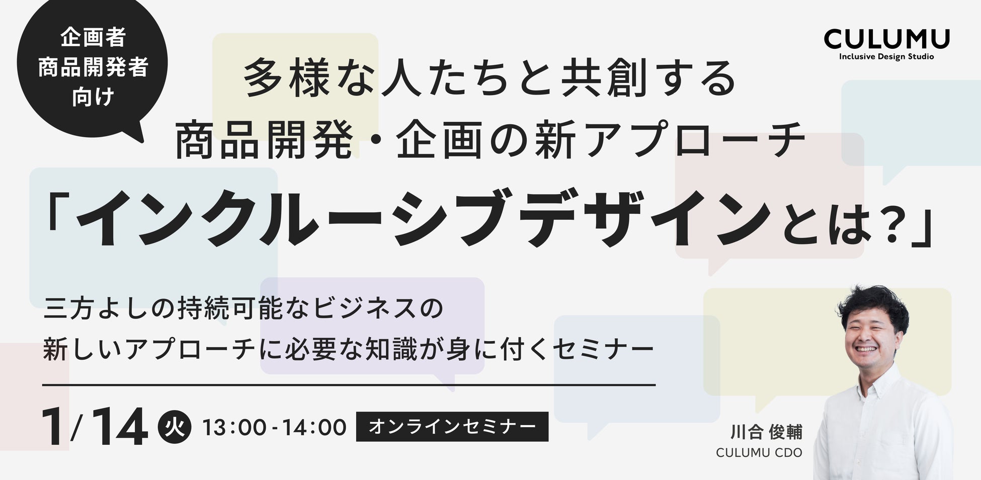 【1/14 セミナー開催のお知らせ】多様な人たちと共創する商品開発・企画の新アプローチ「インクルーシブデザインとは?」三方よしの持続可能なビジネスの新しいアプローチに必要な知識が身に付くセミナー