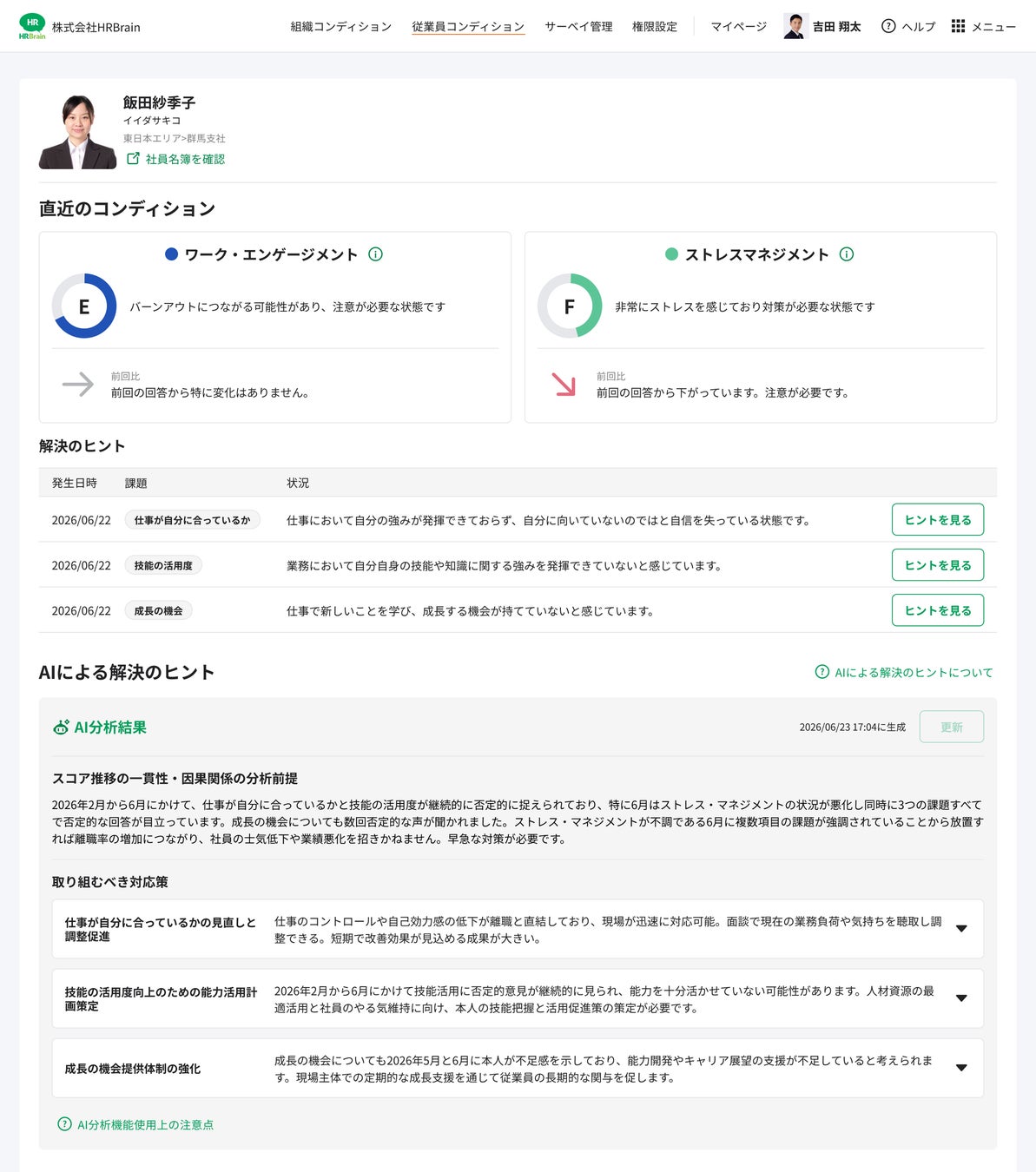 過去の回答データを参照し、現在の従業員の状態をAIが要約して傾向を提示します。