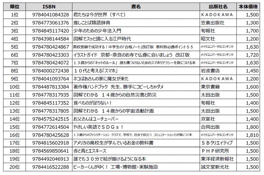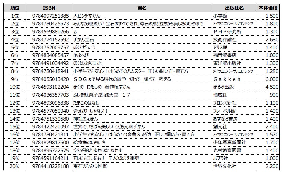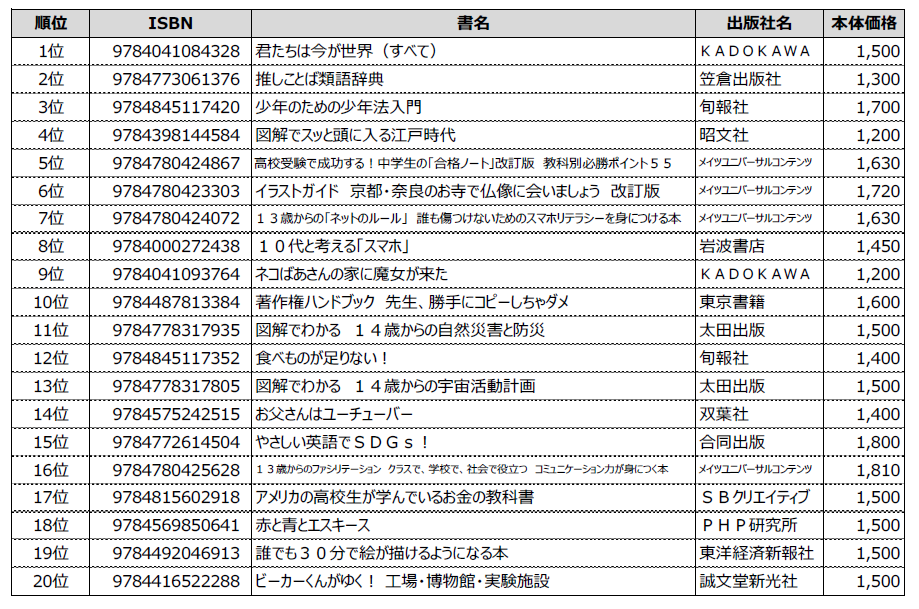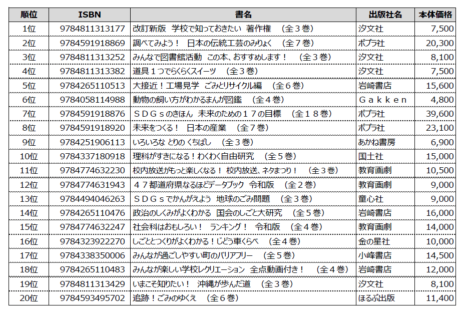 日販図書館選書センターでは、当センターに来場した学校図書館関係者によって選書された図書を、選ばれた回数によってランキング化し、毎年発表しています。学校図書のトレンドを映すランキングとして、図書館をはじめ、小中学生向けの選書の参考にご活用ください。