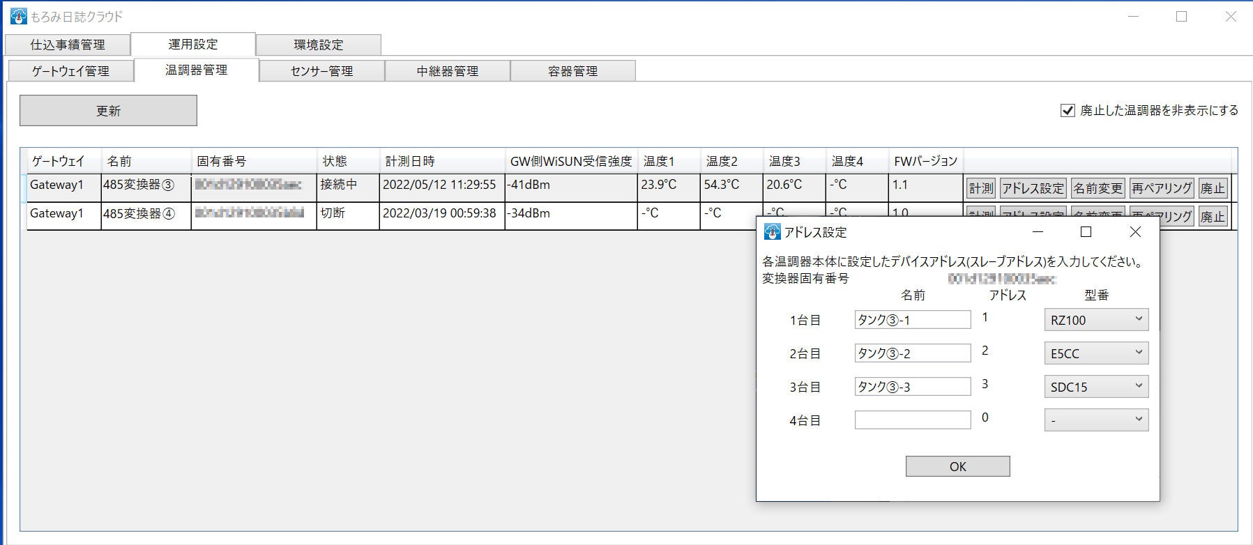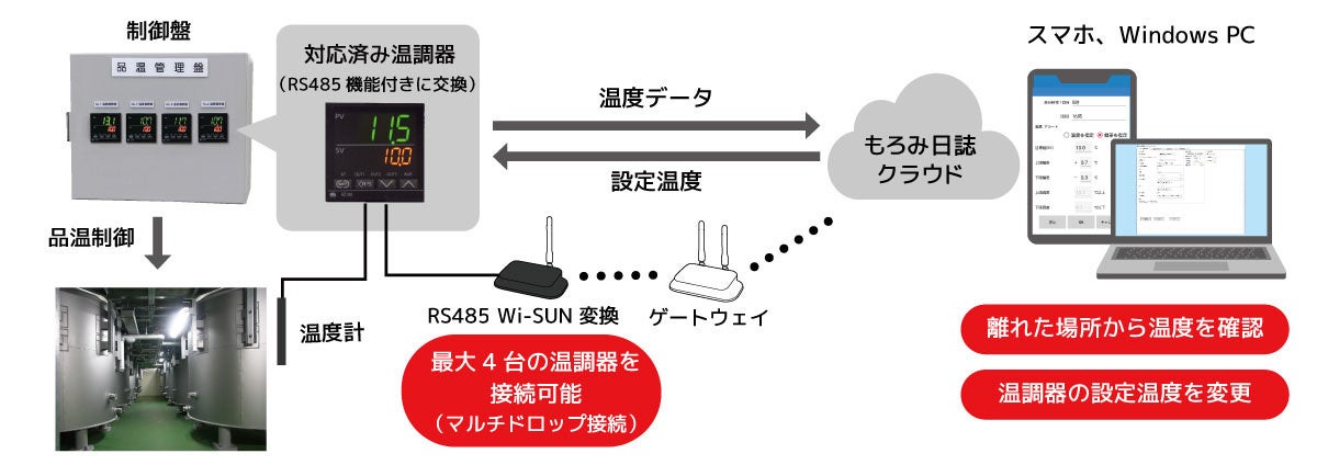 お客様が導入済みの制御盤に搭載している温調器が、RS485通信機能つきの当社指定モデルに交換可能であれば、改造にてもろみ日誌クラウドが使用できます。本システムはRS485マルチドロップに対応し、ひとつの変換ユニットで温調器4台までの接続に対応しています。