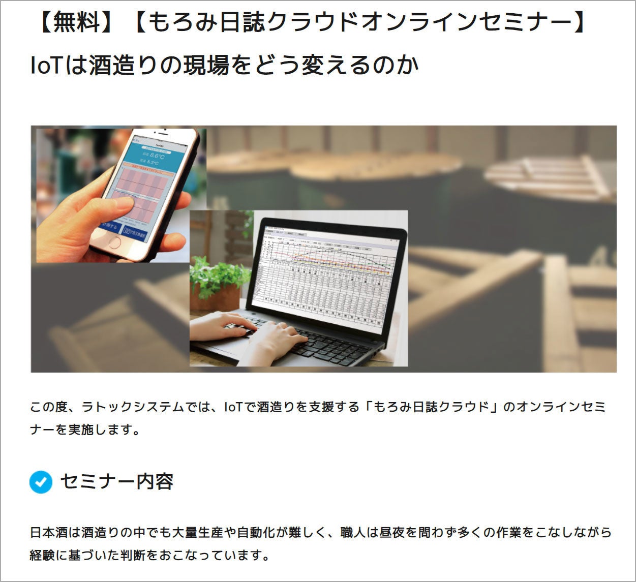 「IoTは酒造りの現場をどう変えるのか」と題した、もろみ日誌クラウドオンラインセミナーを開催いたします。本セミナーでは、品温管理をシステム化することで日常の作業がどう変わるのか、実際にもろみ日誌のデモを交えてご紹介します。