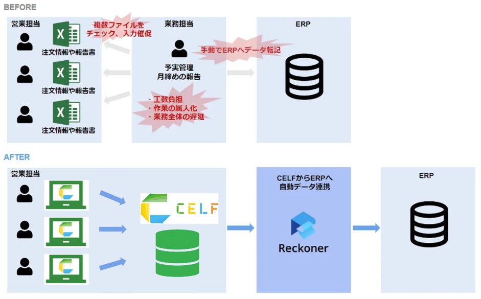 CELFとReckonerを活用して注文情情報をERPに自動連携することで、これまで手作業で行っていたERPへのデータ転記作業が不要になります。また転記作業がなくなることで、データ更新作業における人的ミスが排除されます。
