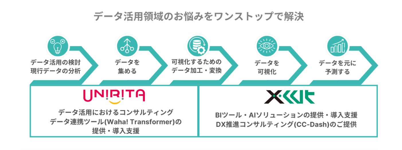 DX推進支援フレームワーク「CC-Dash」(https://xcc-dash.jp/)を提供する株式会社クロスキャット(本社:東京都港区、代表取締役社長:山根光則、以下クロスキャット)と、株式会社ユニリタ(本社:東京都港区、代表取締役 社長執行役員:北野 裕行、以下 ユニリタ)は、データ活用領域において両社の強みを生かし、顧客に対する一気通貫の価値を提供していくことを目的とした協業を開始しました。
