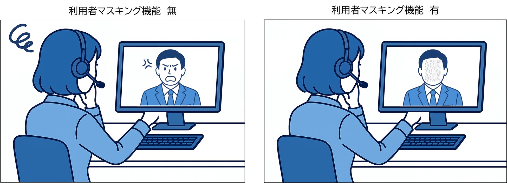 店舗や窓口などでの遠隔接客時に、端末に映る利用者の顔をAIが自動で判定し、マスキング処理を施します。これにより、オペレーターは顔が見えない状態で応対できるため、カスタマーハラスメントによる心理的負担を軽減することができます。また、利用者の肖像権保護にも配慮した安心・安全な接客環境を提供します。