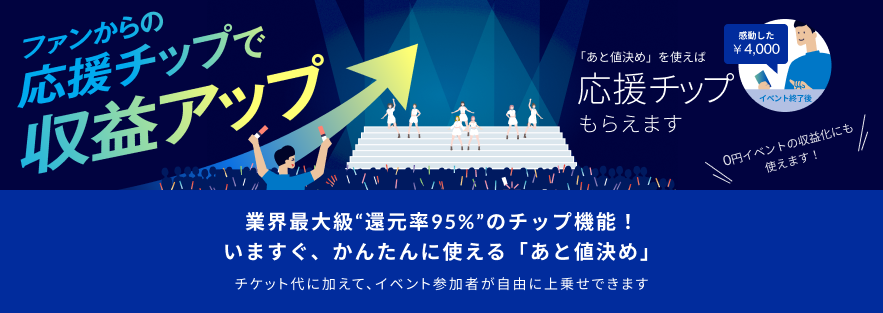 イベント終了後、チケット購入者がチケット代に「応援チップ」(※1)を上乗せして支払うことができるイベント形式です。