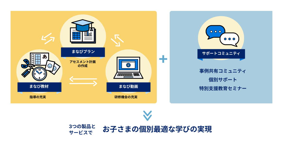 LITALICO教育ソフトは「まなびプラン」「まなび教材」「まなび動画」の3つの製品を先生方にご提供し、支援が必要な子どもを担当される先生方の専門性・指導力向上、業務負荷軽減のためのサポートをしています。また、製品のお渡しに加えて先生方を対象としたサポートサービスも実施し、先生方の情報交換の場や学びの場のご提供や、学校全体でのインクルーシブ教育体制構築に貢献しています。