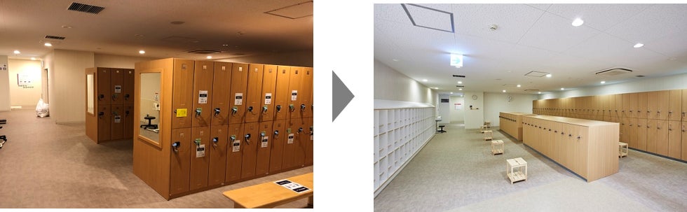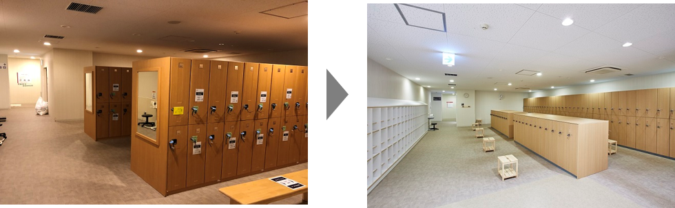 ②お客様のご利用ニーズに合わせてサービス内容を刷新し、成人用ロッカールームを、時間に応じてジュニアスクールのお子様も利用できる空間に変更しています。また、ライフスタイルに合わせてご利用できるように、トレーニングジムは24時間化しました。