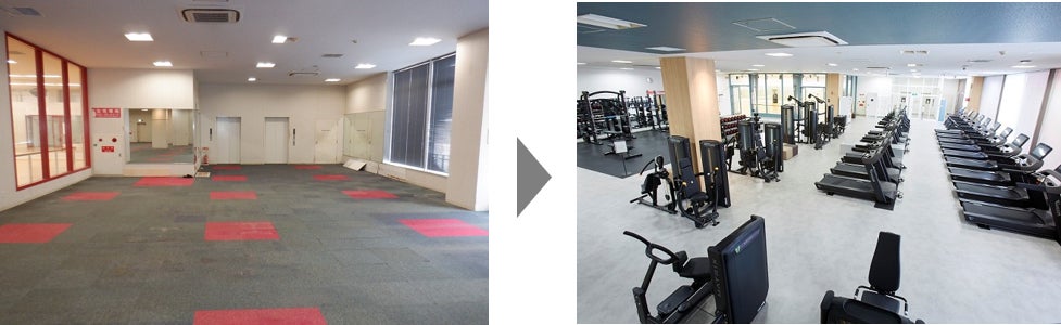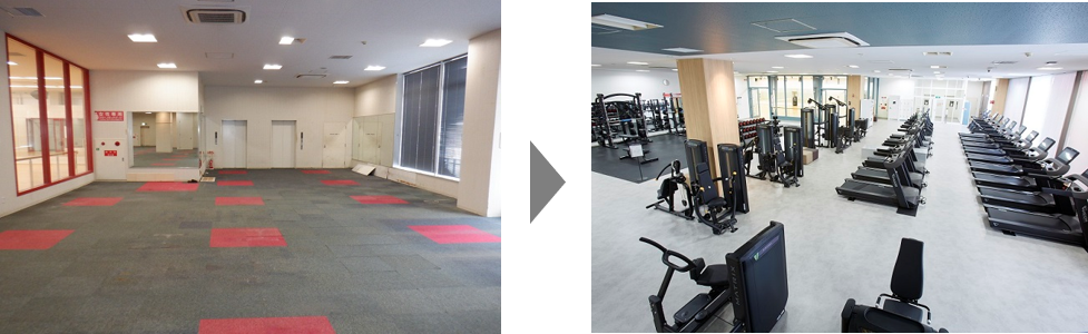 当施設は、過去、他社が運営していた施設のトレーニングジム、スイミングプール、お風呂などのスポーツクラブ設備を、当社の施設開発及び施設メンテナンスのノウハウを活かしてリノベーションしたものです。今回、24時間営業のトレーニングジム、ジュニア&成人スイミングスクールの開講等を加え、新たなスポーツクラブとして生まれ変わりました。