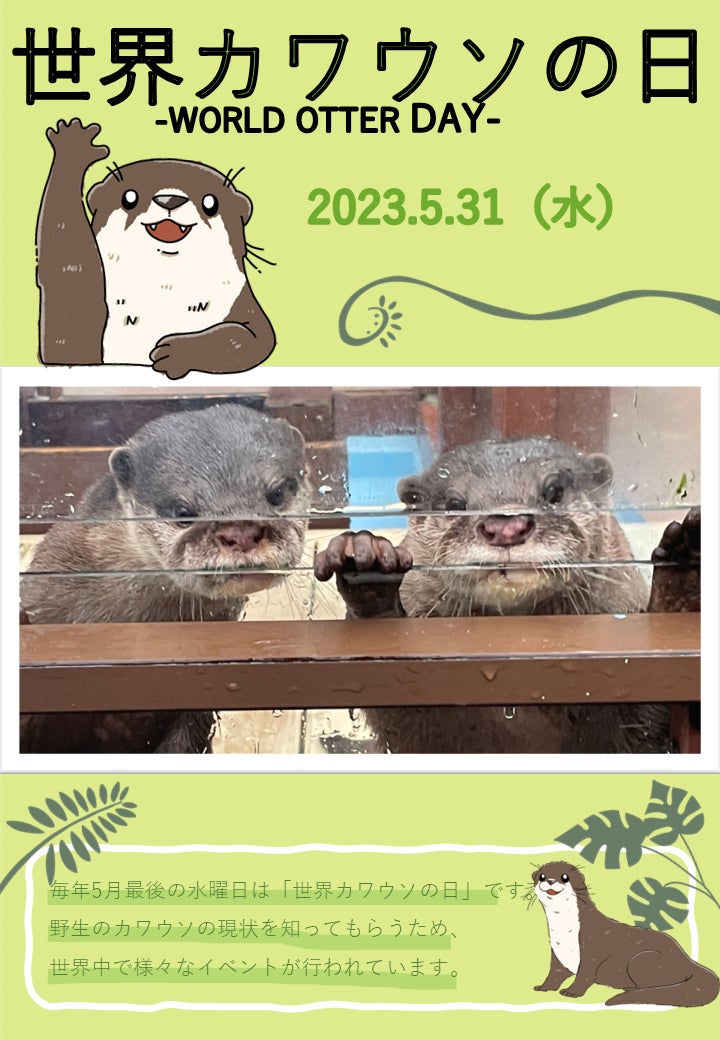 「世界カワウソの日(World Otter Day)」とは、野生下で絶滅の危機に瀕しているカワウソ類の現状や生態について、さらには飼育園館での取り組みを広く知ってもらうためにInternational Otter Survival Fund (国際カワウソ保護(生存)基金)が制定したもので、毎年5月の最終水曜日に行われています。今年の令和5年は5月31日(水)がその日にあたります。世界カワウソの日には、世界各地の施設でカワウソの保全に関する啓蒙活動やイベントが行われております。