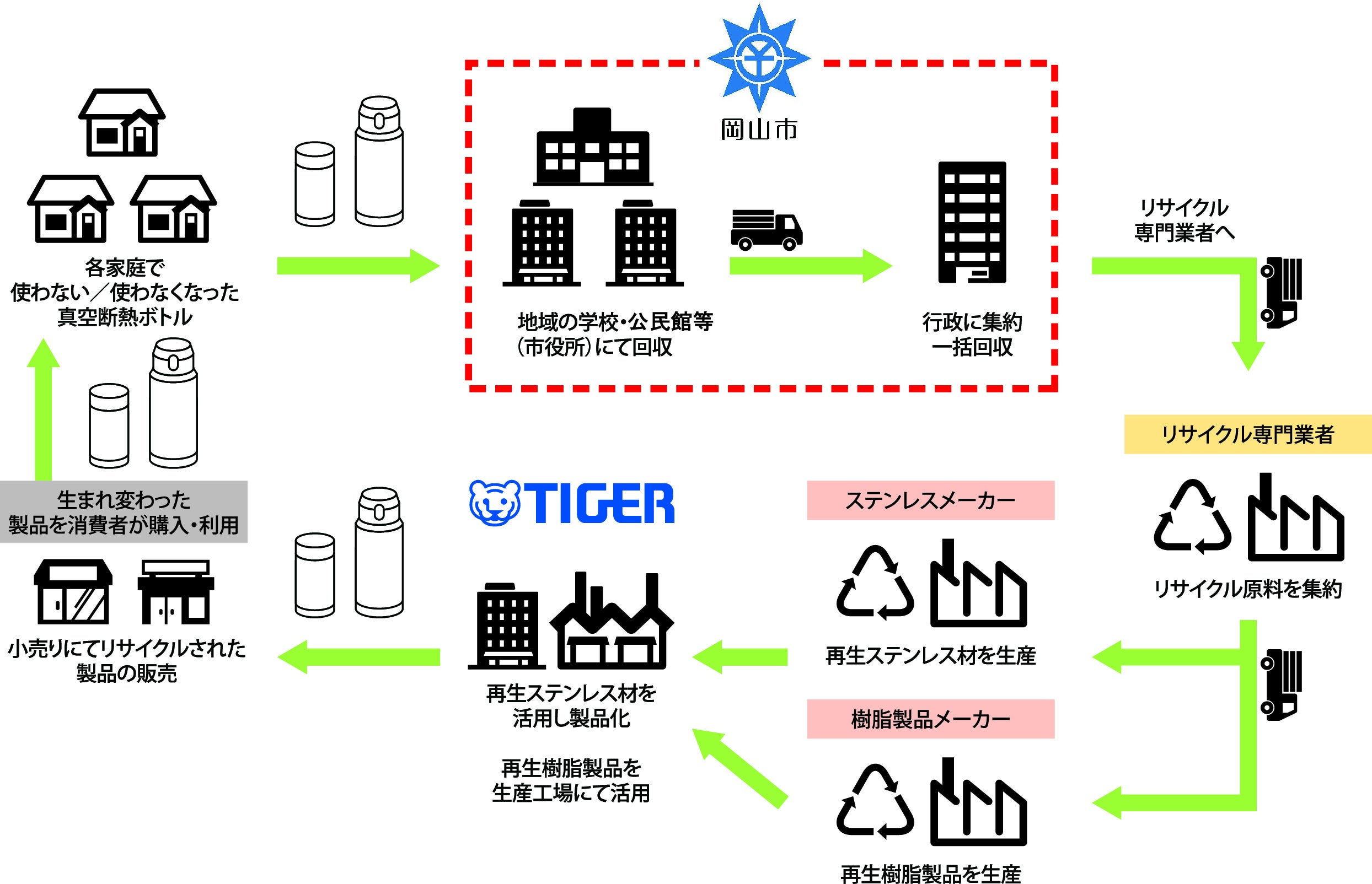 ご家庭で不要になったステンレス製ボトルを地域の学校・公民館等にて回収し、リサイクル専門業者へ集約。集まったリサイクル原料から再生ステンレス材および再生樹脂製品を生産します。再生ステンレス材は新たな製品へと生まれ変わり再びお客様の元へ、再生樹脂製品は当社の各生産工場にて活用するといった再資源化モデルを構築しています。
