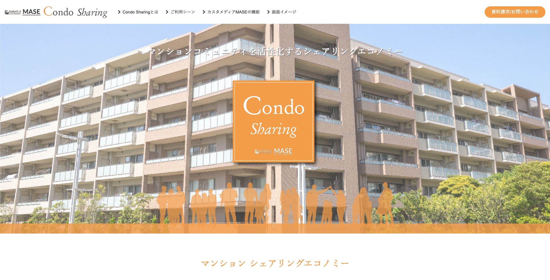 「Condo Sharing」とは、シェアリングエコノミーの様々な機能をSaaSで提供するカスタメディアMASEをベースとした、マンションコミュニティ特化型のシェアリングエコノミーツールです。同じマンションに居住する住民間で、モノやスキルの貸し借りや売り買いを仲介することができる、新たなマンションコミュニティを創造するシェアリングエコノミーツールとなっています。