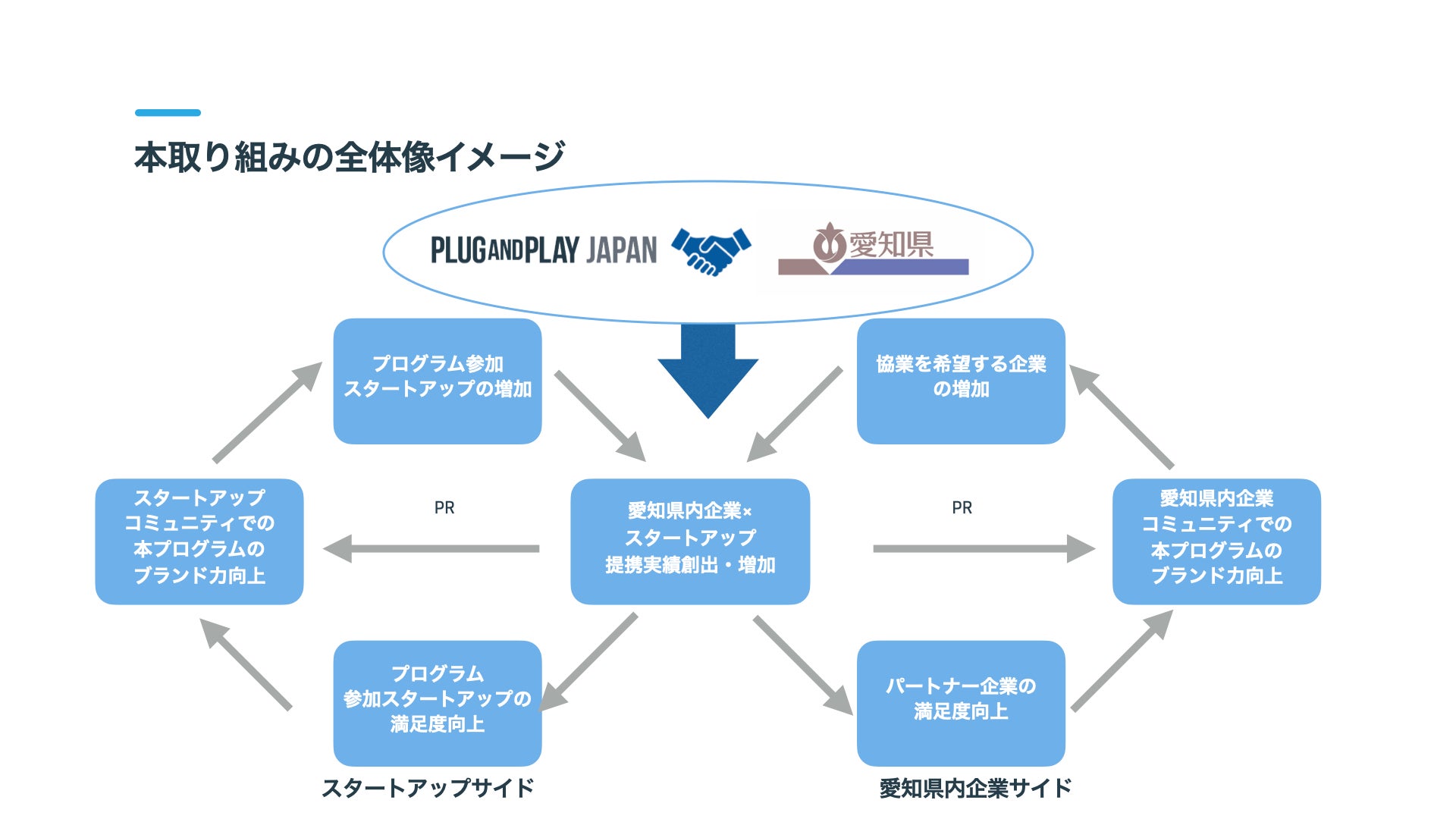本事業では愛知県の企業と国内外のスタートアップを繋げ、協業実績を積み上げることで、愛知県のスタートアップ・エコシステムに企業やスタートアップが集積し、さらなる協業が生まれるという好循環を生み出すエコシステムの構築を目指しています。また、愛知県発スタートアップがシンガポールでネットワークを構築し、海外進出への足掛かりとなる機会の創出も支援していきます。