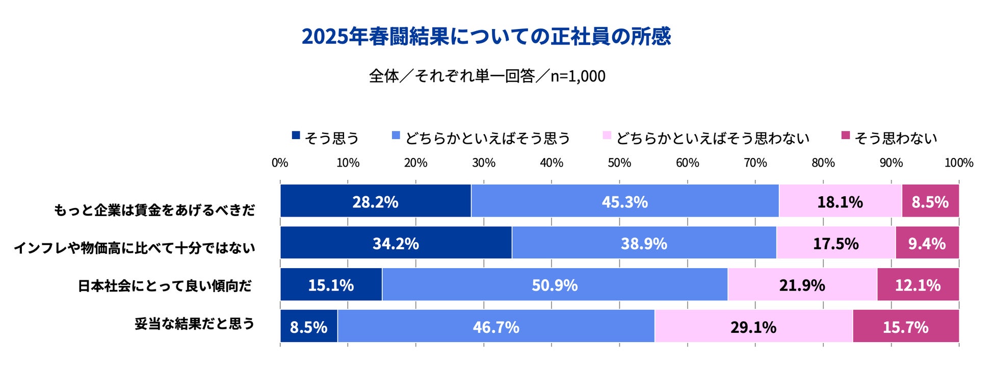 2025年春闘結果について、73.5%が「もっと企業は賃金をあげるべきだ」、73.1%が「インフレや物価高に比べて十分ではない」