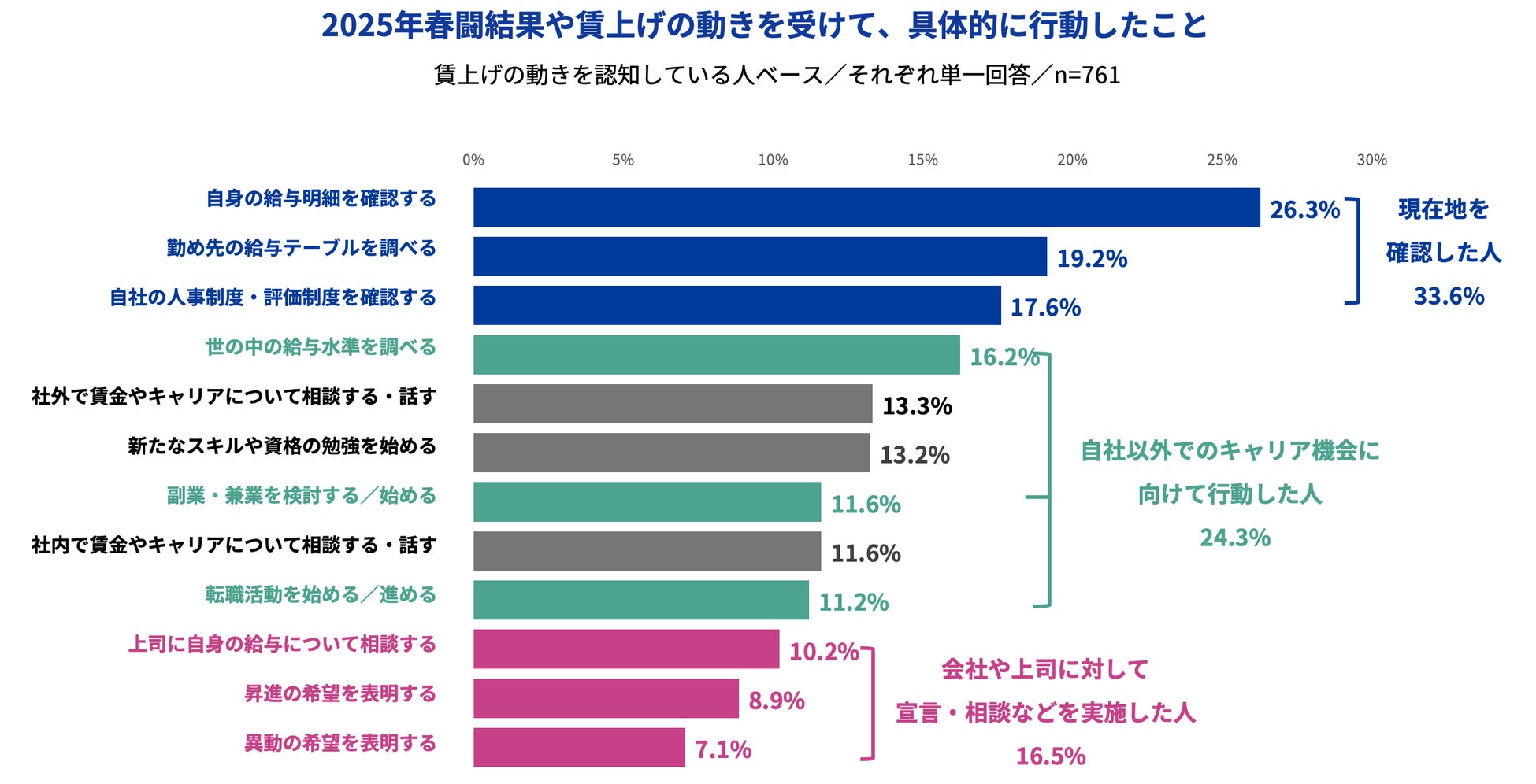 2025年春闘結果や賃上げの動きを認知している人(761名)を対象に、これらの動きを受けて、賃金・キャリア・働き方に関する意識・行動に変化があったかを調査しました。