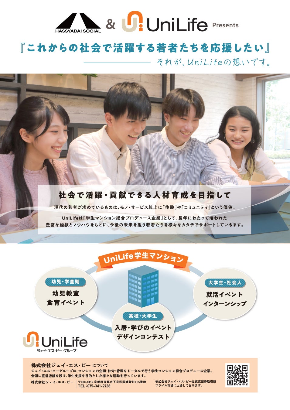 UniLife(ユニライフ)のブランドで全国の学生マンションの企画開発・仲介斡旋・運営管理までをトータルで行う株式会社ジェイ・エス・ビー(本社:京都府京都市、代表取締役社長:森 高広、以下 当社)は、一般社団法人HASSYADAI social(以下:ハッシャダイソーシャル)が実施する高校生年代を対象とした教育機関向けのキャリア教育プログラム「お仕事図鑑」での住宅リテラシー教育の提供、および若者が詐欺被害に遭わないための『騙されない為の教科書』の配布・啓蒙活動を行う取り組みについて2025年4月より連携を開始します。
