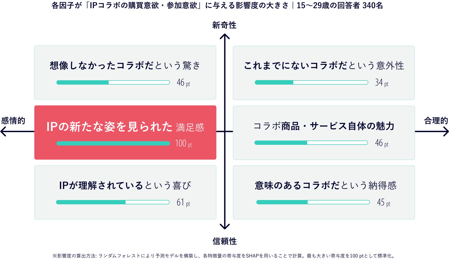 「コラボしている企業やブランドに対しての、愛着の高まり」を特に押し上げるのは【「意味のあるコラボだ」という納得感】でした。若者にとって、企業がIPの世界観や設定を理解し、ファンと同じ「目線」を持っていると感じられると、それが企業への信頼につながります。