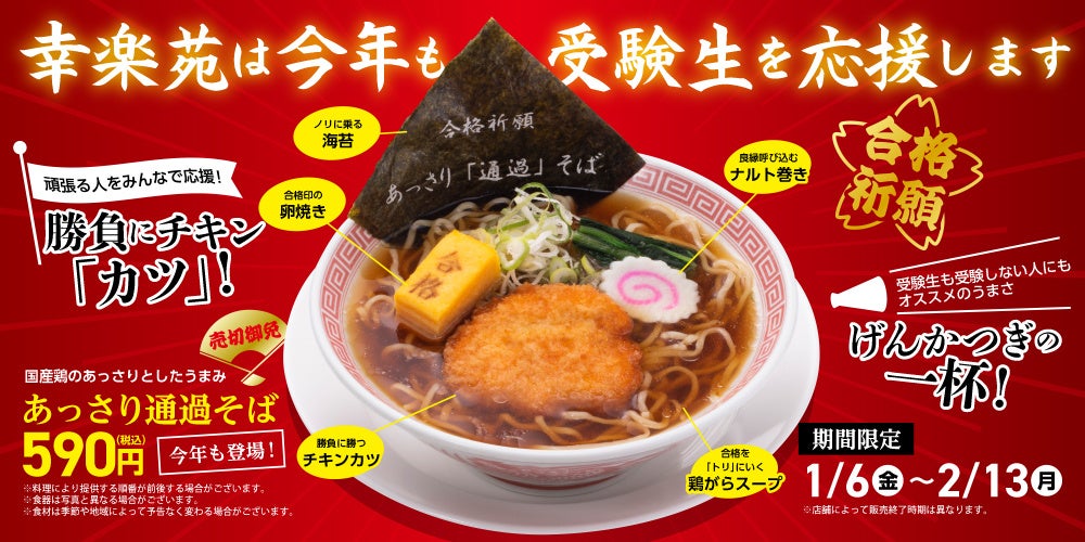 幸楽苑で験担ぎ!合格祈願の「あっさり通過そば」期間限定で登場!今年も幸楽苑は頑張る受験生を応援します!