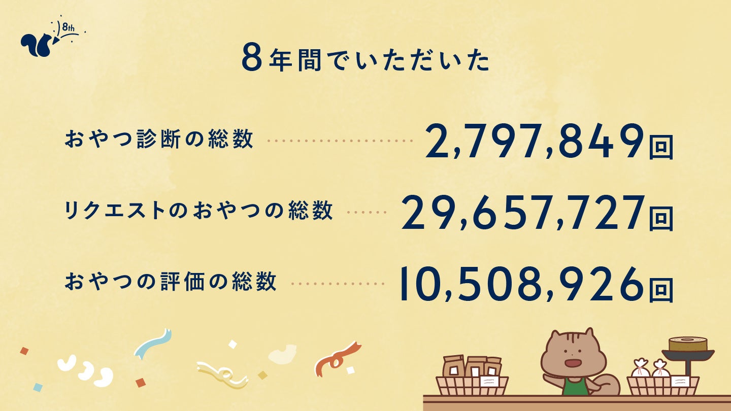 今年でお客様からいただいたデータの総量(おやつ診断の総数・リクエストのおやつの総数・おやつの評価の総数)は合計で4,000万を超えました。