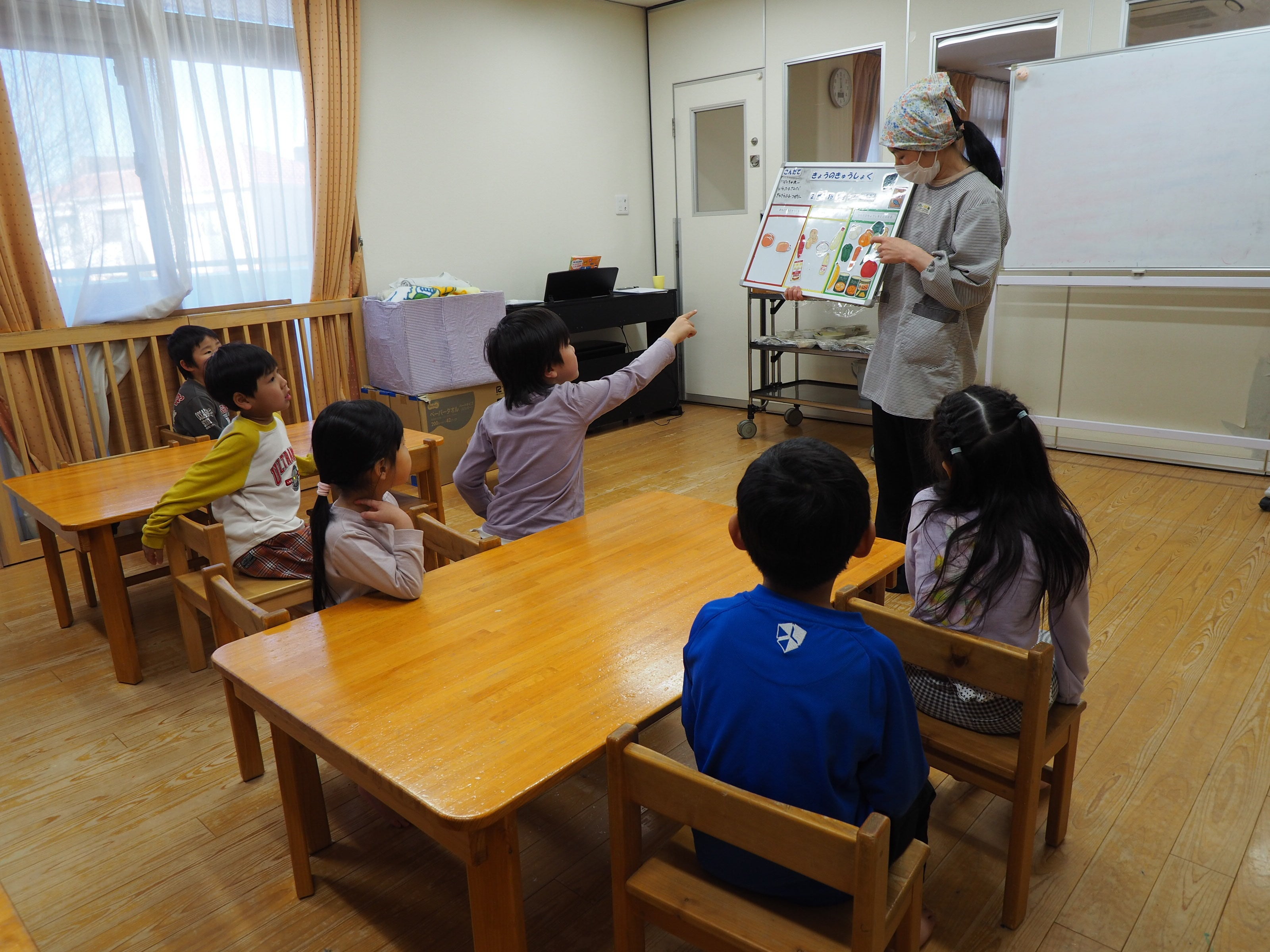 当日、たいよう組(5歳児)では給食職員が「にじいろ給食」で使用した野菜が三色食品群でどの色になるか、どこの地域で採れた野菜なのかといった話をすることで、ただ食べるだけでなく学びのある給食となりました。子どもたちからは「今日は(三色食品群の)緑のお野菜がいっぱいだね」といった声があがるなど、得た知識をすぐに発信し理解を深めています。また、色とりどりの「にじいろカレー」を見て「緑、黄色、オレンジもあるー!」「にじいろカレー、前からずっと楽しみだったんだ!」と声をあげる子どもたちも多く、昨年から実施となった「にじいろ給食」を心待ちにしている様子がうかがえました。