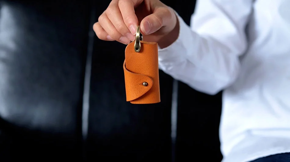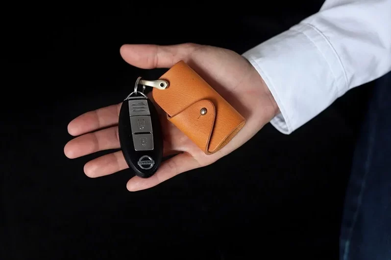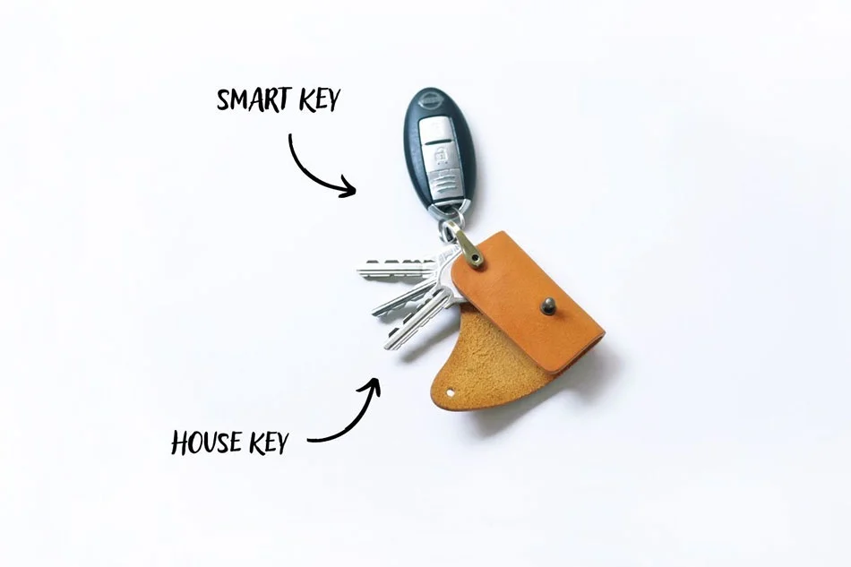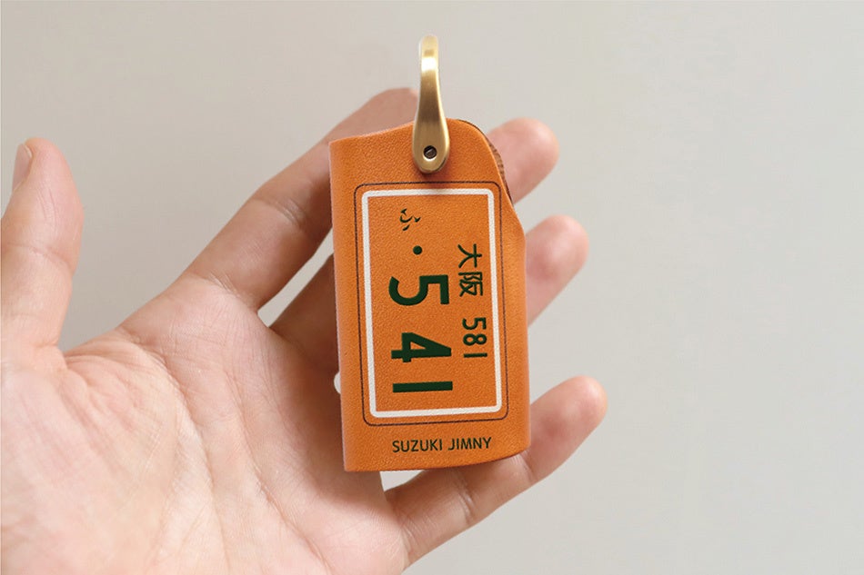 公式LINEにナンバープレートの写真を送るだけで革職人がハンドメイド。スマートキーと鍵をコンパクトに収納。