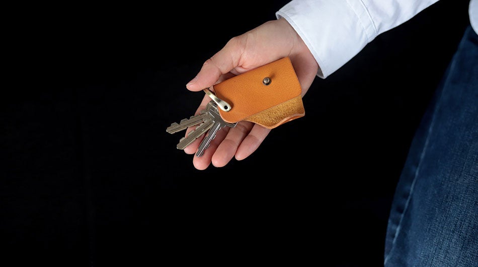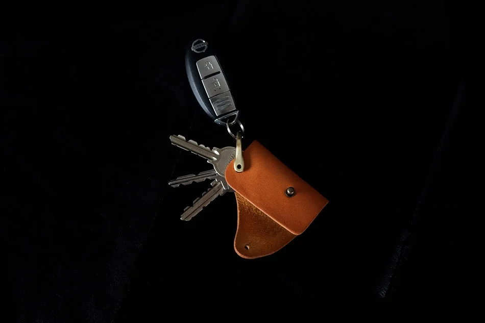 車のスマートキーと家の鍵を取り付けることができる革のコンパクトなスマートキーケース。 13g(約ボールペン1本分)と超軽量につくられました。小さいふ専門店クアトロガッツ の革職人がコンパクトさにこだわってハンドメイド。