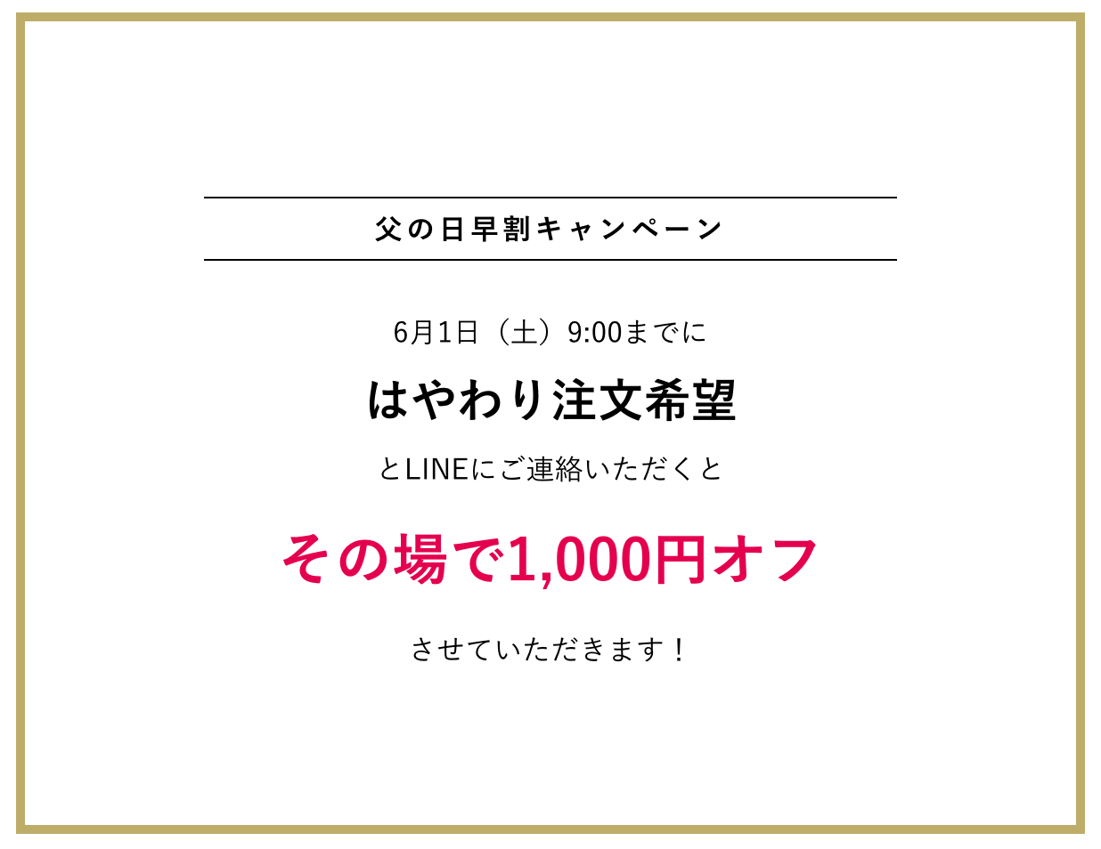 5月〜6月1日まで「父の日早割1000円OFFキャンペーン」開催中