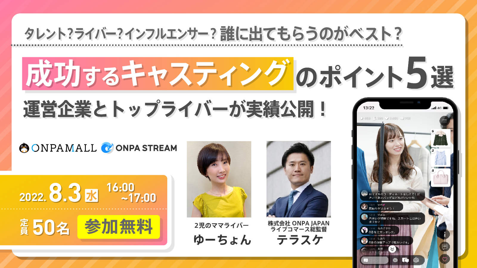 株式会社ONPA JAPAN(東京都渋谷区、代表取締役:恩地 佑亜 /以下、ONPA JAPAN)が無料ウェビナーを開催いたします。ライブコマースに興味のある方や新たな販売方法をご検討中の企業様向けのウェビナーです。