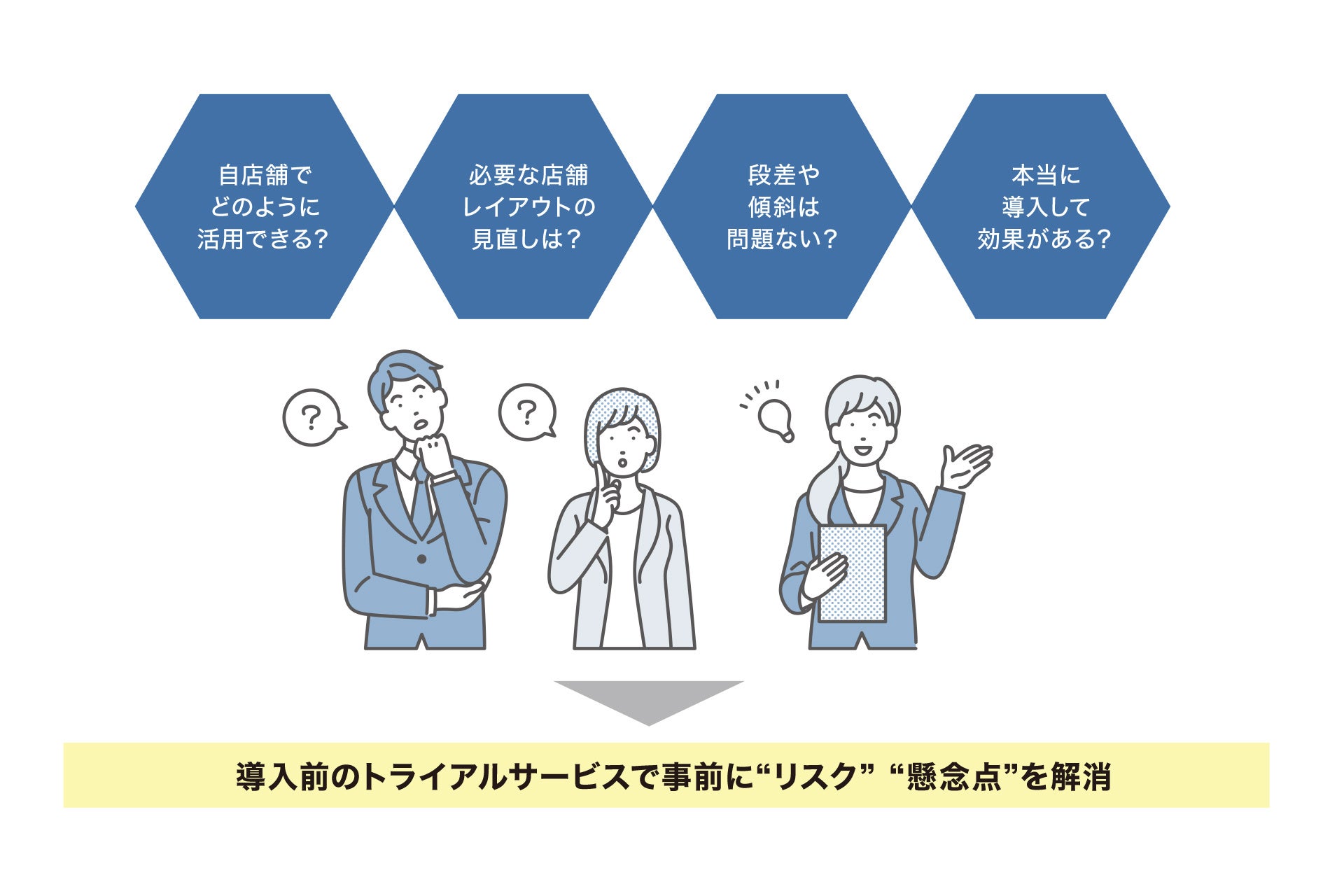 導入前に実際に製品をお試しいただけるサービスも展開中です。スタッフがお客様のもとで設定、試運転を実施します。購入を検討している実際の製品をお客様の施設でお試し可能なため、導入前に自社での運用イメージを膨らませ、疑問点を事前に解消できます。