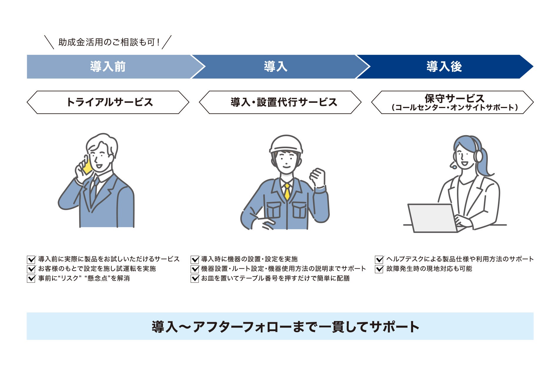 導入のタイミングで機器設置・ルート設定・使用方法の説明まで代行することで、設置後お皿を置いてテーブル番号を押すだけで簡単に配膳できる「導入・設置代行サービス」を実施しています。さらに、急に動かなくなった、操作方法を知りたい、充電がされない、電源が入らないなどの製品に対するお問い合わせに対して、コールセンターもしくはオンサイトで対応する「保守サービス」をご用意。助成金活用のご相談も可能です。