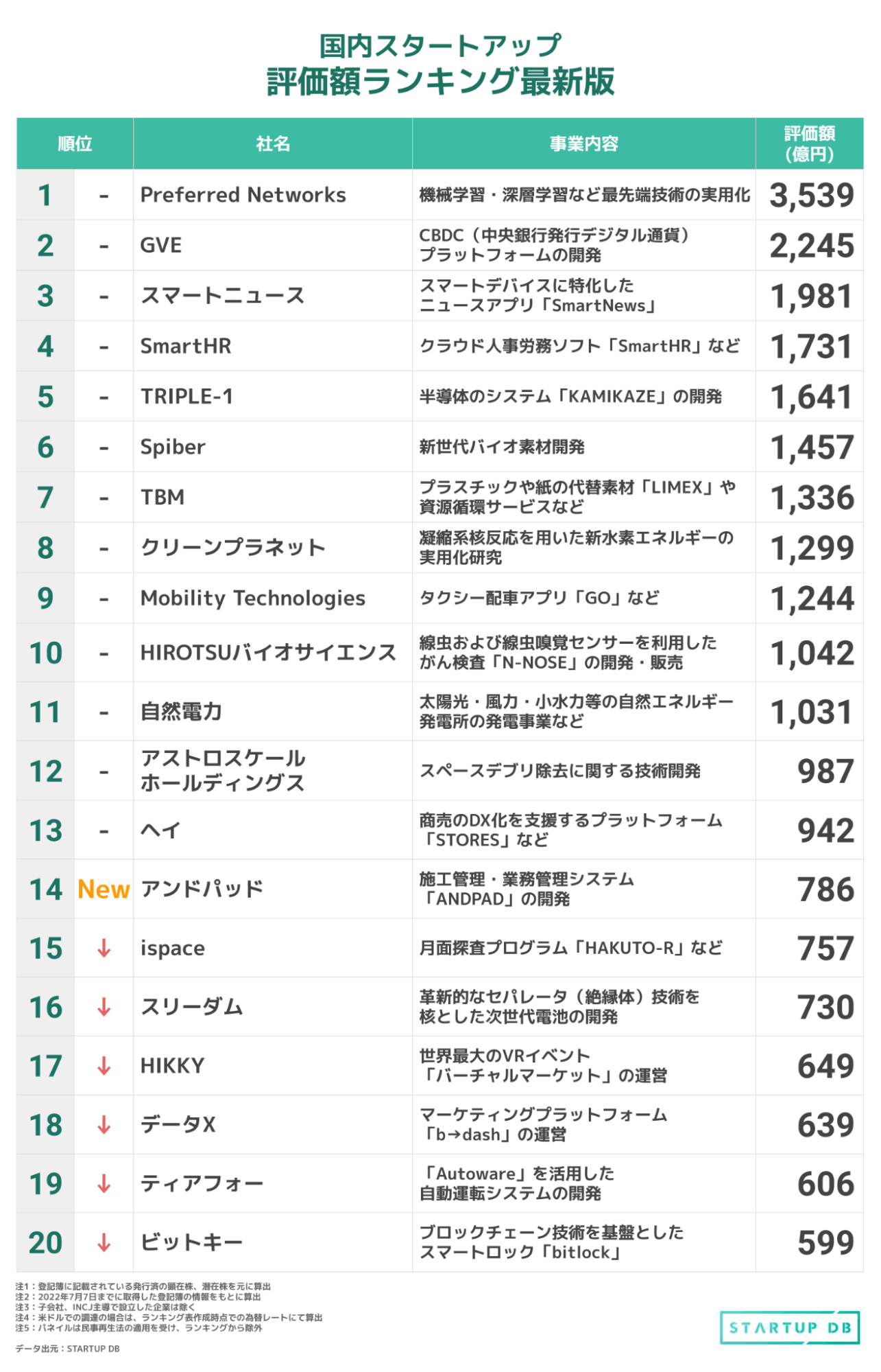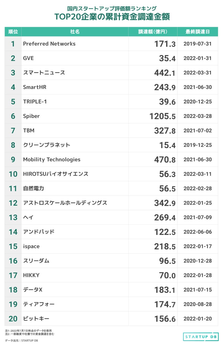 【STARTUP DB】調査結果 国内スタートアップ評価額ランキング最新版(2022年7月)