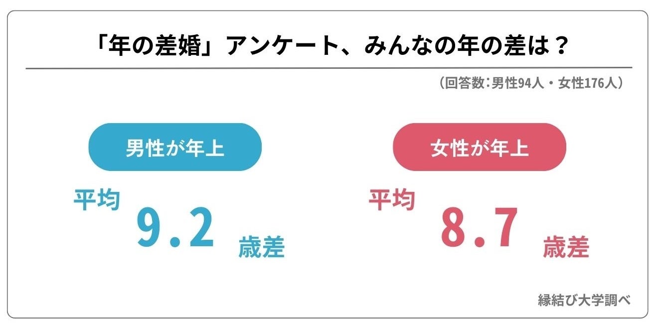 今回、パートナーと6歳以上の年の差がある男女240人にアンケートしました。240人の平均は、男性が年上のケースで9.2歳差、女性が年上のケースで8.7歳差でした。