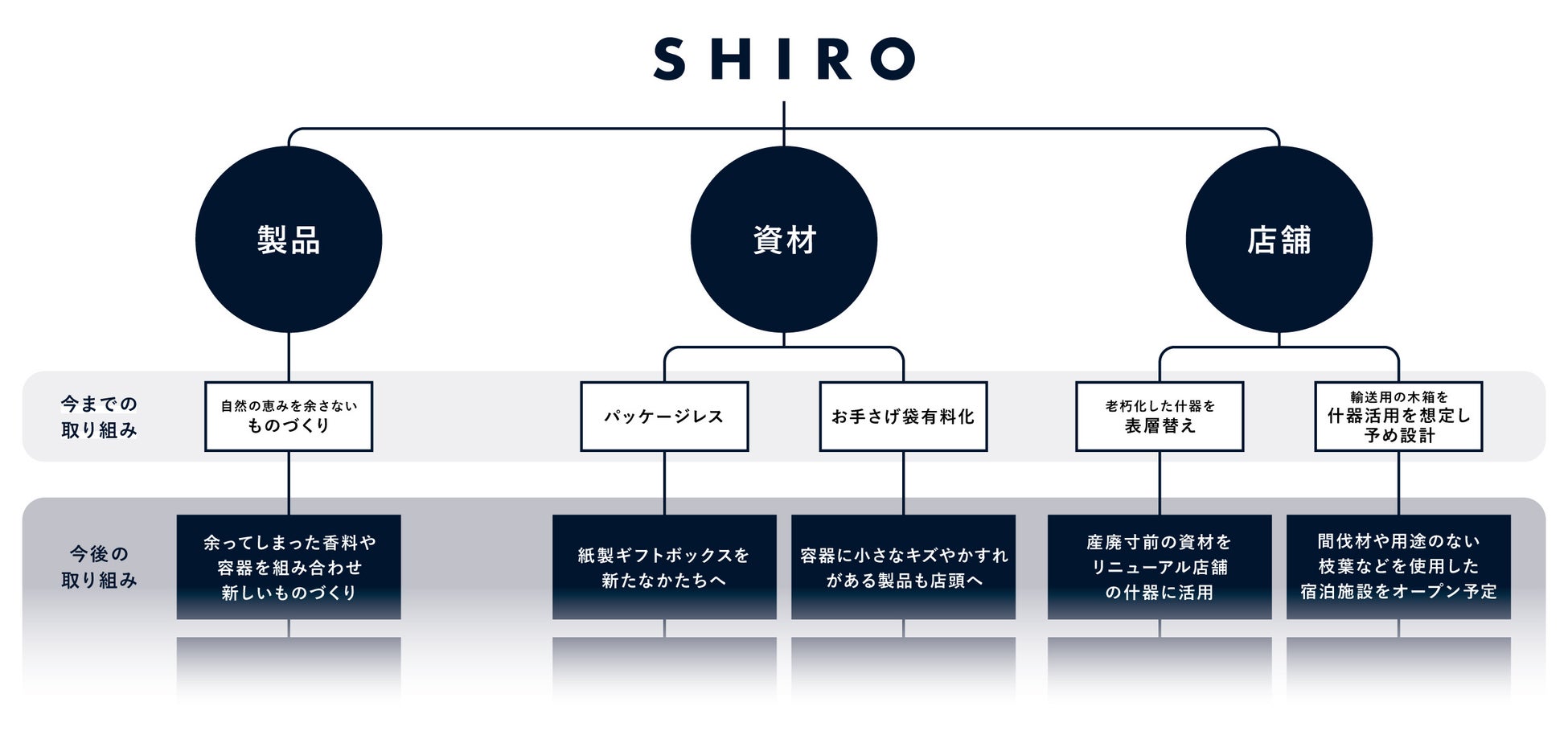 厳しい自然が育んだ素材を国内外から見つけ出し、そのちからを最大限に引き出すスキンケア、メイクアップ、フレグランスアイテムを提案。日本全国に直営店舗を展開するほか、ロンドンや台湾に実店舗を構え、米国では自社EC、中国では越境ECでの販売を行う。製品に使う素材同様、厳選した食材を届ける食のセレクト[SHIRO LIFE]、素材のおいしさを料理で伝えるカフェ[SHIRO CAFE]、SHIRO が提案する美しさを最大限体感できるサロン[SHIRO BEAUTY]などの業態も展開。