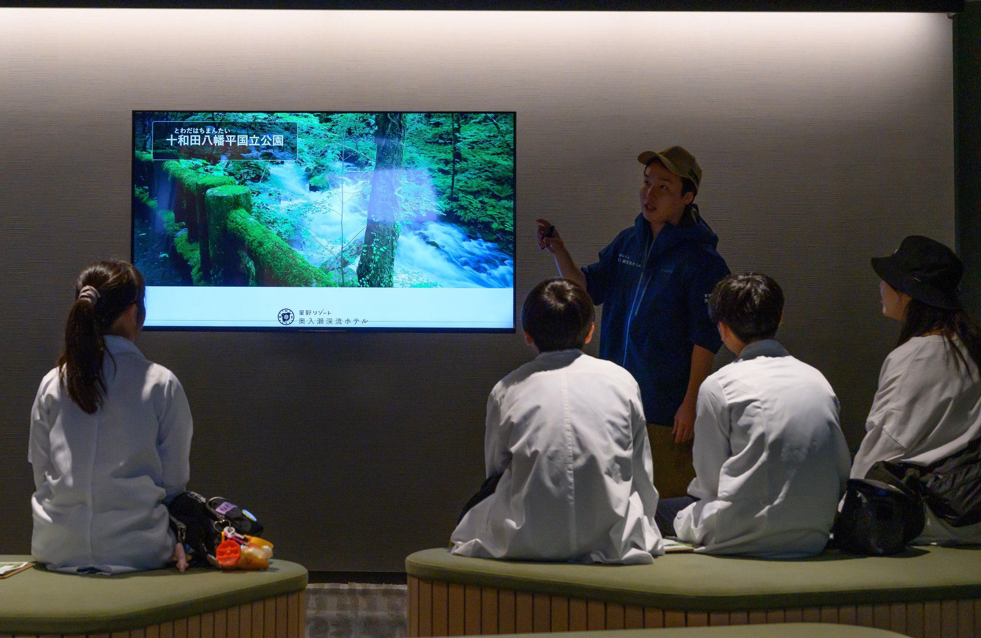 星野リゾートでは、これまでに「旅」を形作る上で欠かせない要素として、その土地ならでは魅力や体験の提供を大切に考えてきました。当ホテルの目の前を流れる奥入瀬渓流は、国立公園内に属し、特別名勝、天然記念物、特別保護地区に指定されています。後世にこの自然を残していくためには、地元の方々がその魅力を理解し、自然への関心を高める取り組みが重要だと考えています。後世を担う子どもたちが自然を学び、理解を深め、この先も守っていきたいという価値観を育てる機会にしたいという思いで、本取り組みに至りました。2023年は奥入瀬渓流が「日本の貴重なコケの森」に選定されてから、10年目となる節目の年です。この機会に、奥入瀬渓流の自然には欠かせない「コケ」の魅力に触れ、理解を深めてほしいという思いで、自由研究プログラム「奥入瀬コケ博士」の体験会を実施しました。