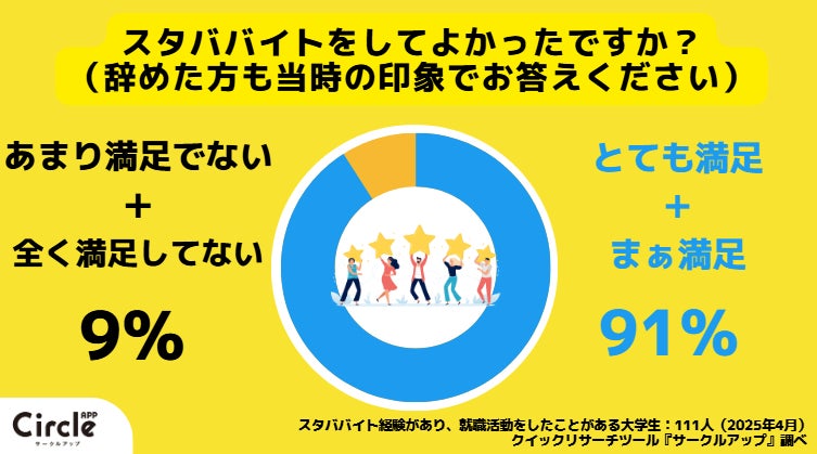 「スタバでのバイトは満足だったか?」という質問に対し、「とても満足している」「まあ満足している」と回答した人が合わせて91%にのぼりました。