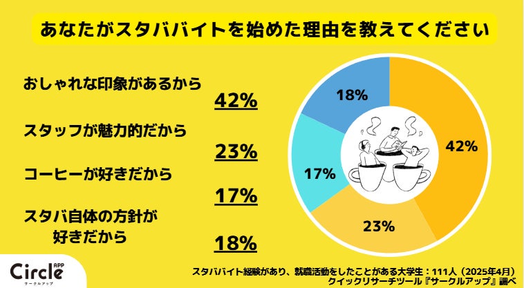 スタババイトを始めた理由として最も多かったのは「おしゃれな印象があるから」(41%)。次いで「スタッフが魅力的」(21%)、「コーヒーが好き」(17%)と続きます。