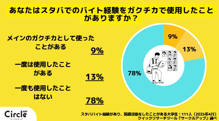 「スタバでの経験を就活で使ったことがあるか」との質問には、「メインで使用」した人は9%、「一度だけ使用した」が13%と、2割の大学生がガクチカで使用してことがあると回答しました。