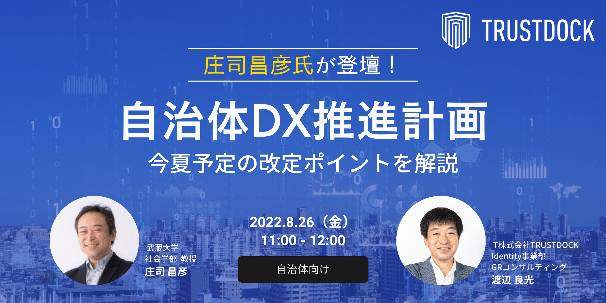 株式会社TRUSTDOCK(本社:東京都千代田区、代表取締役:千葉 孝浩、以下 TRUSTDOCK)は、「地方自治体のデジタルトランスフォーメーション推進に係る検討会 」の座長である武蔵大学社会学部教授の庄司昌彦氏をゲストにお招きし、今夏改定予定の自治体DX推進計画のポイントを解説する無料ウェビナーを2022年8月26日(金)に開催いたします。