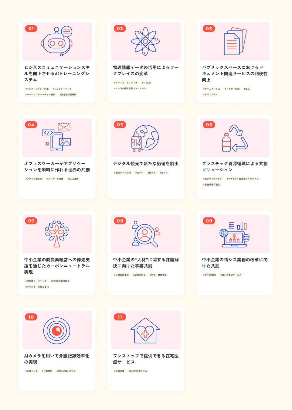 以下11の事業領域と、その他リコーグループのアセットを活用した自由なテーマにて募集します。