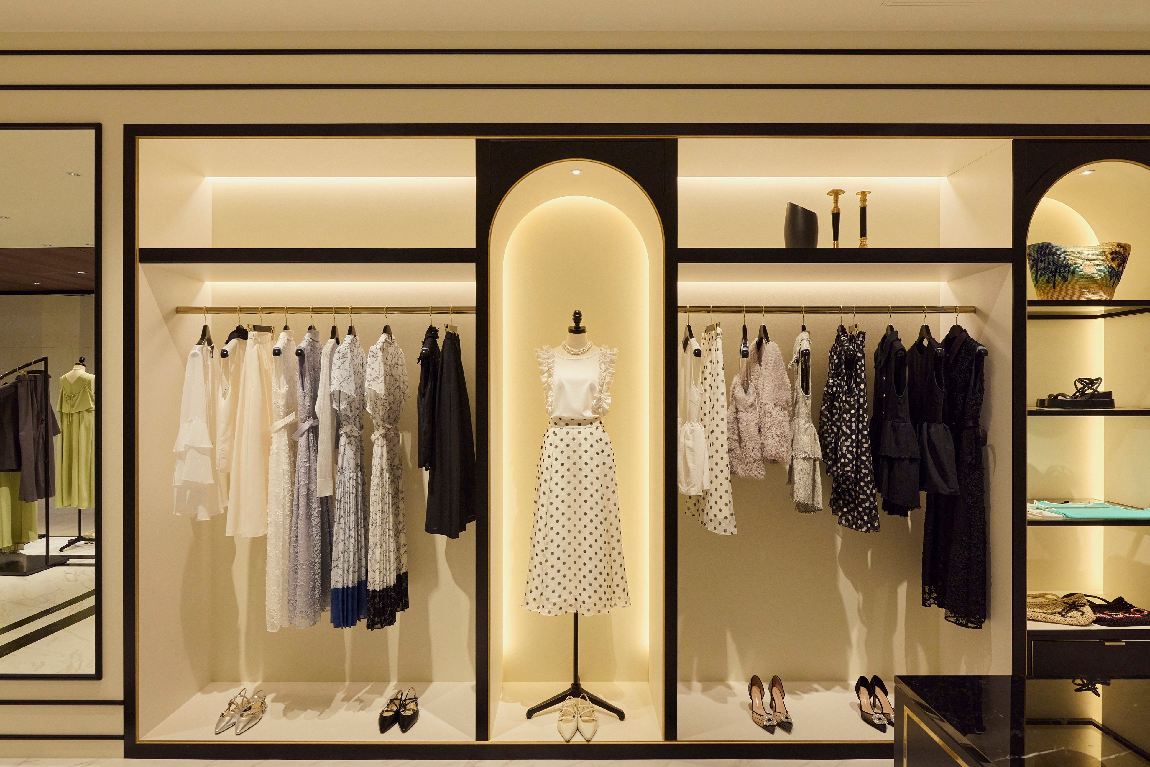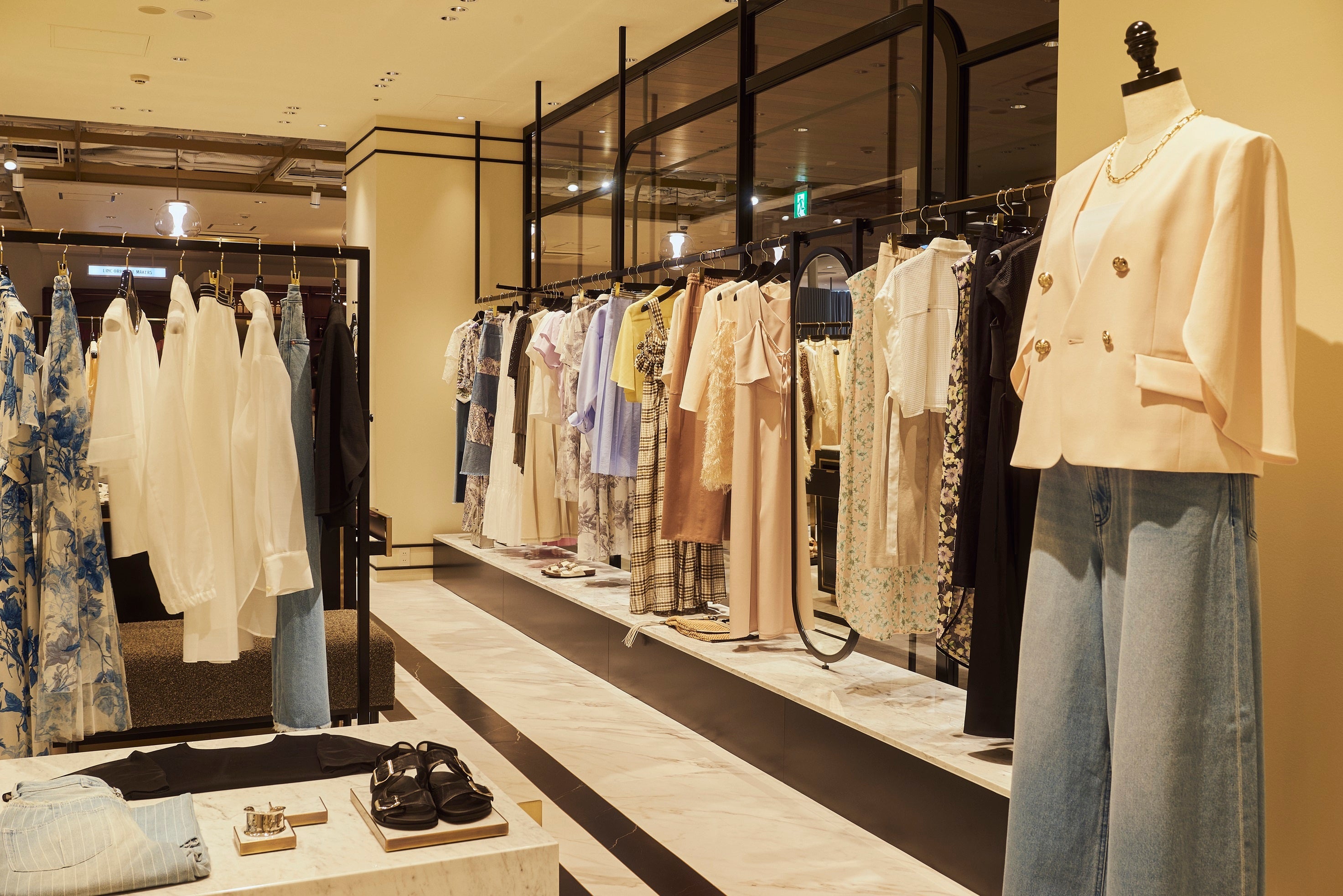 「GRACE CONTINENTAL ONE FUKUOKA BLDG.店」は、曲線を活かした壁面や幾何学模様の大理石什器などを用い細部にまでこだわった、モノトーンのシックなデザインにアートピースが映える空間です。幅広い世代の天神ワーカーや、韓国・台湾・中国を中心としたインバウンド観光客に向け、カジュアルからドレスラインまでフルラインアップし、ブランドの魅力を発信します。