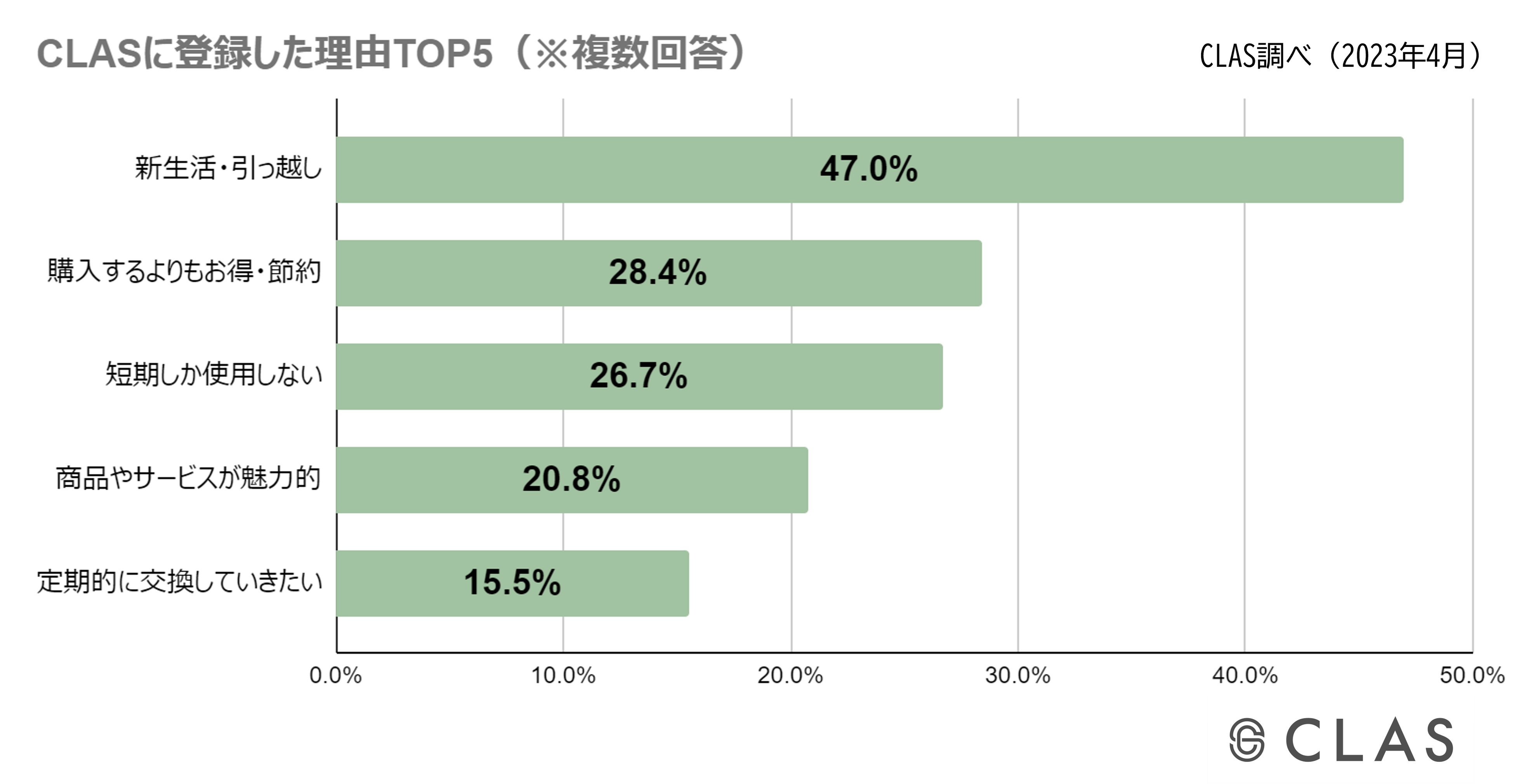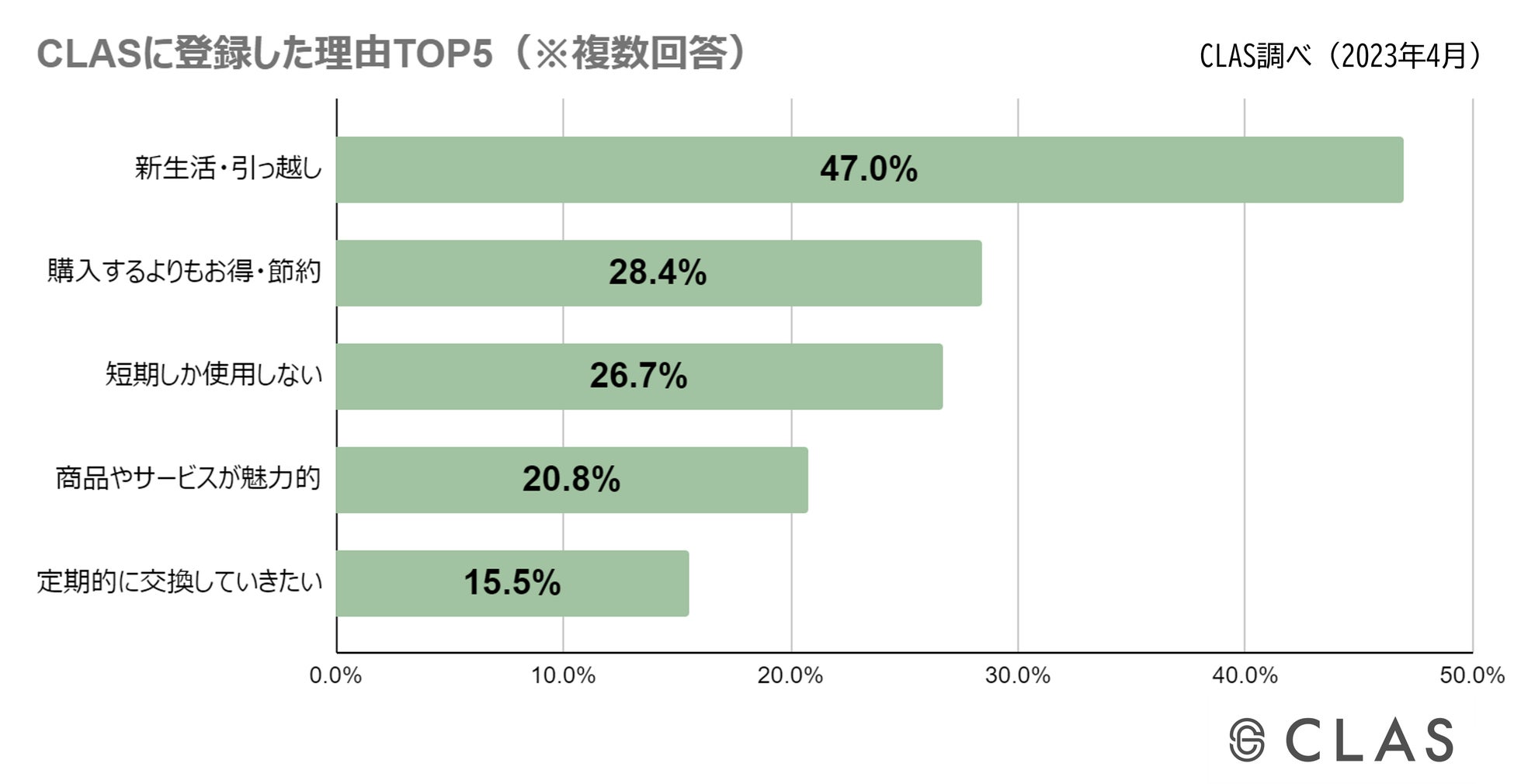 2023年4月に実施したCLAS登録者を対象にしたユーザーアンケートでは、約半数の方が「新生活・引っ越し」を機にCLASへご登録いただいていることがわかりました。
