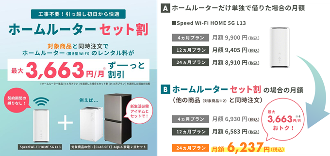 (※4)ホームルーター単品[4ヶ月プラン]と対象商品とセット[24ヶ月プラン]を比較した場合