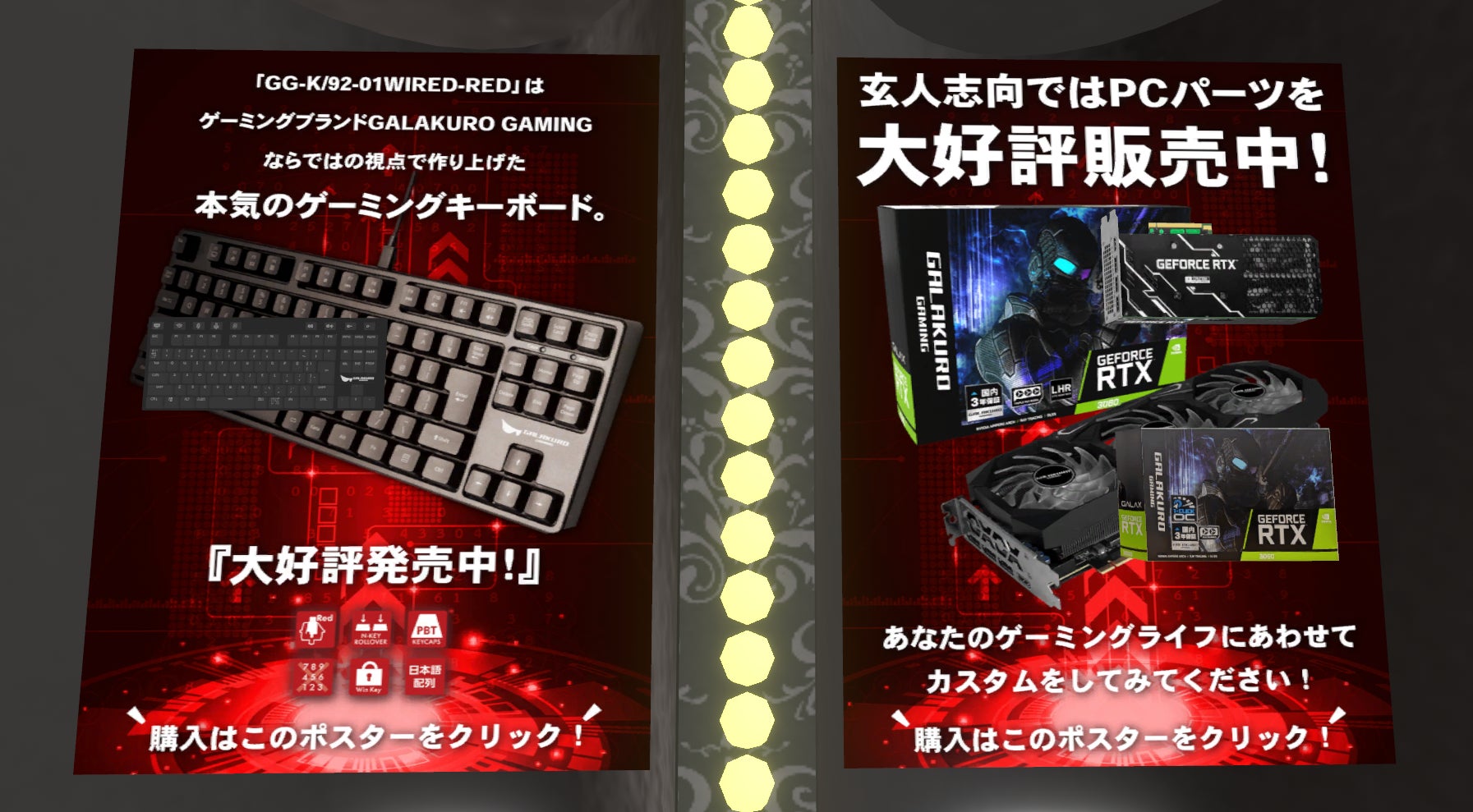 現実世界のPCパーツショップに来た感覚を味わうことができる「玄人志向」ブース。新作の「手元が発光しないゲーミングキーボード」や、PCケース、モニター、グラフィックボード、マザーボード、電源などをメタバース空間上から、ボタン1つでご購入いただけます。購入した商品は、ご自宅などにお届けします。