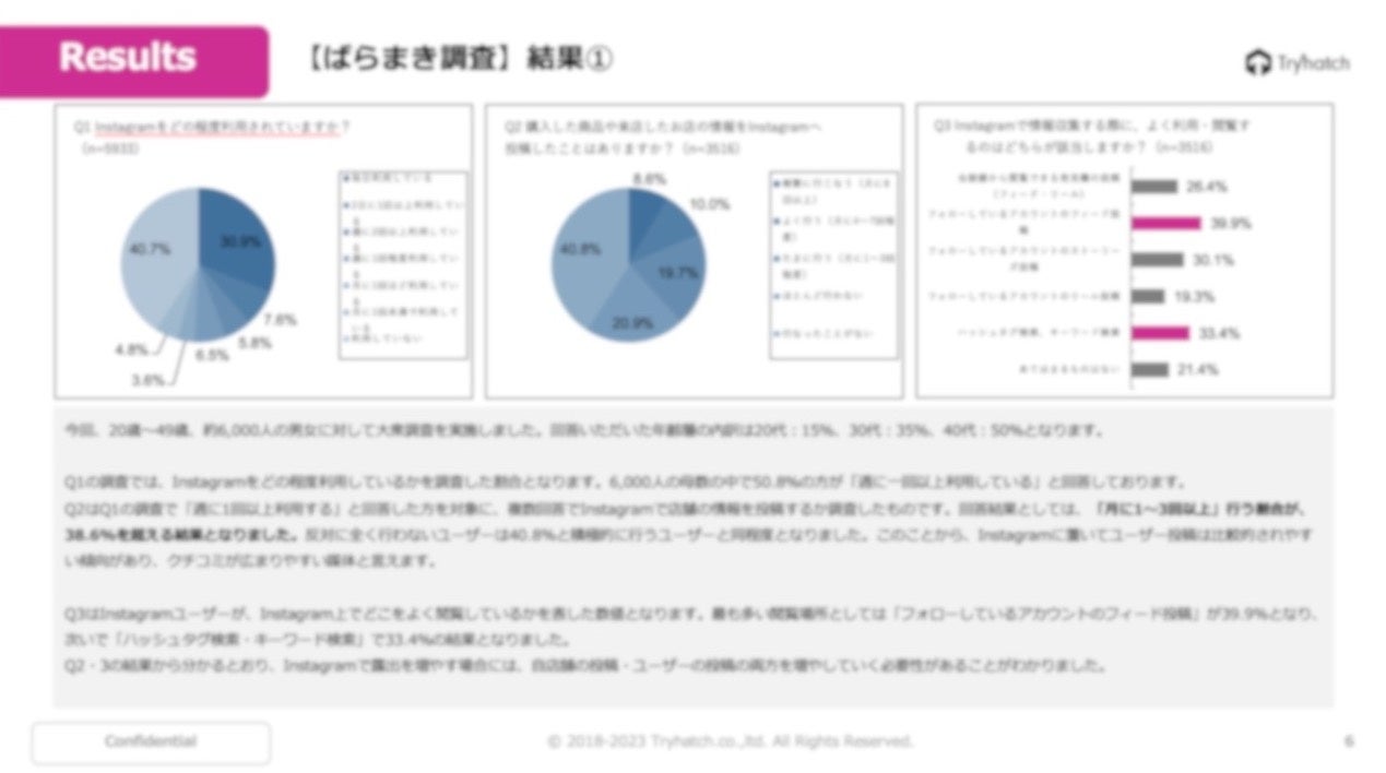 株式会社トライハッチ(東京都新宿区、代表取締役 武藤 尭行)は、6,000人を対象としたInstagramの利用者調査を実施いたしました。レポートでは店舗に特化したInstagramツール「Instaチェキ」を最大限活用できるよう、Instagramから店舗への来店に向けた意識調査をまとめ、公開しています。