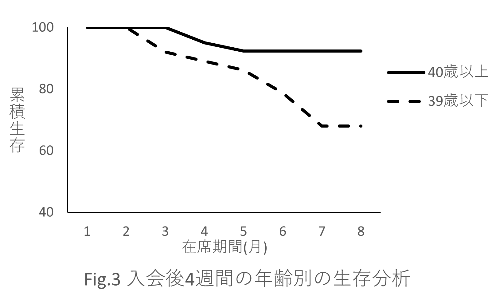 また性別(Fig.2)と年齢(Fig.3)においても同様の分析を行った。男女でLog Rank検定を行ったところ、生存率に有意な差はみられなかった(男性:87.4%, 女性:70.2%, χ2(1)=2.506, p=.113)。一方で年齢においては、39歳以下よりも40歳以上のほうが生存率は高かった(39歳未満:67.9%, 40歳以上:92.3%, χ2(1)=3.884, p=.049)。