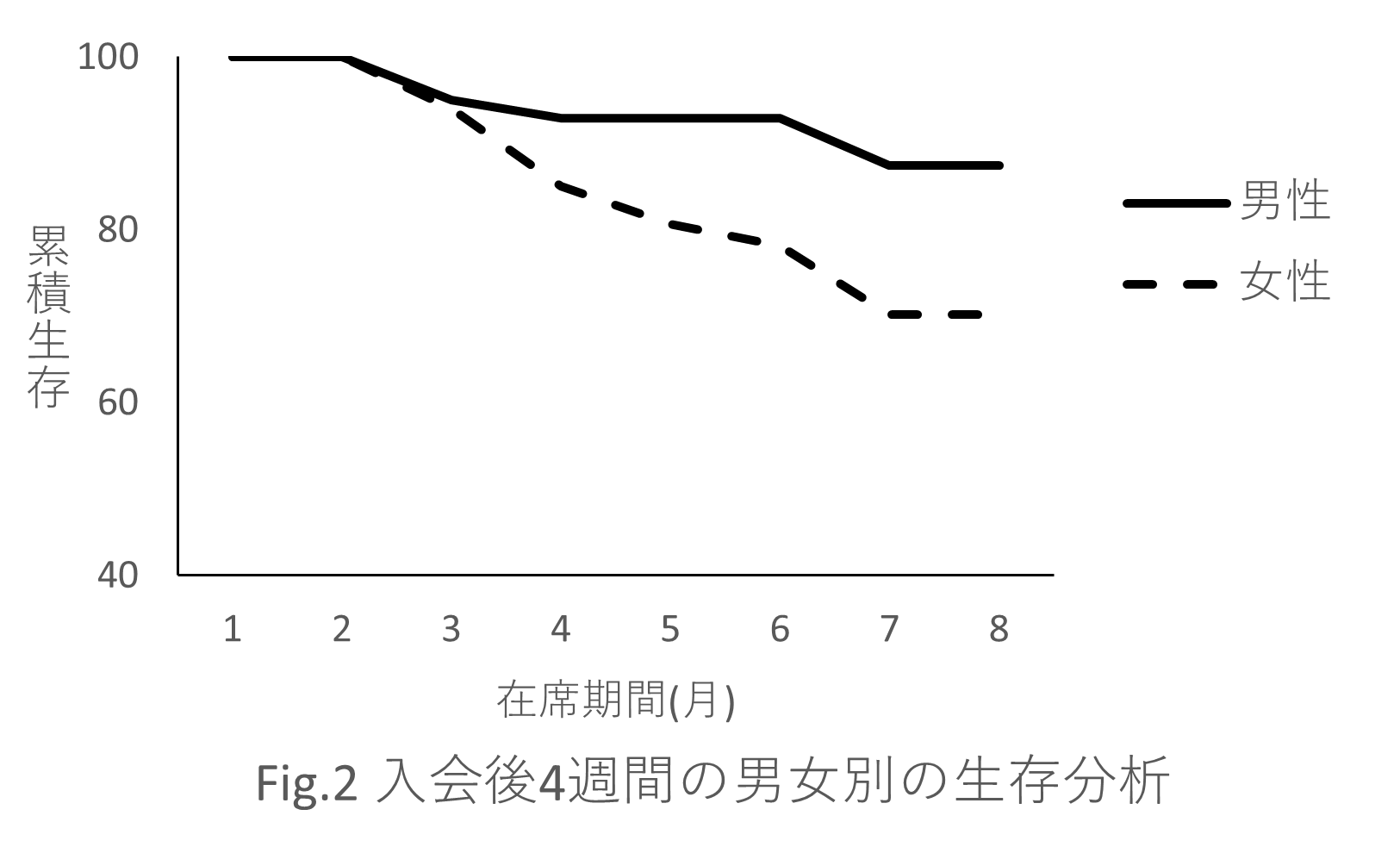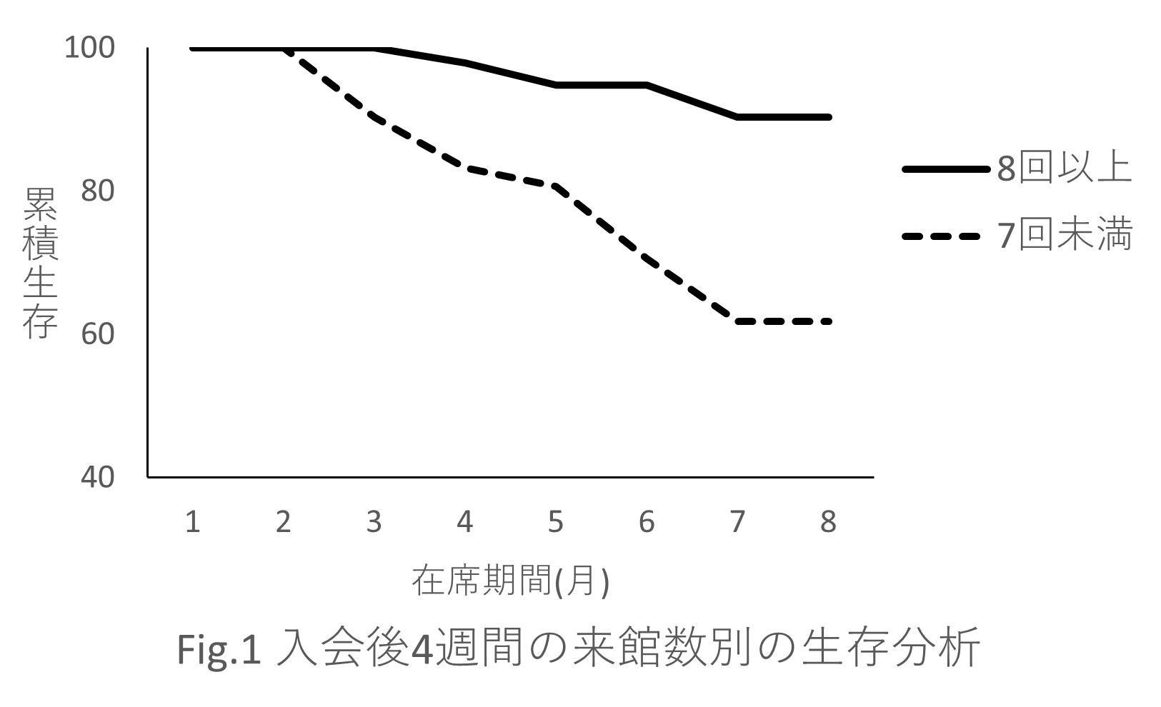 その結果、8カ月時点の生存率に有意な差がみられた(入会後4週来館8回以上:90.2%, 7回未満:61.7%, χ2(1)=7.682, p=.006)。