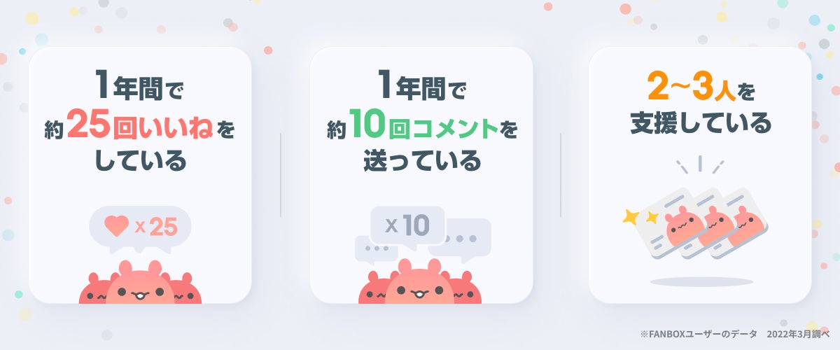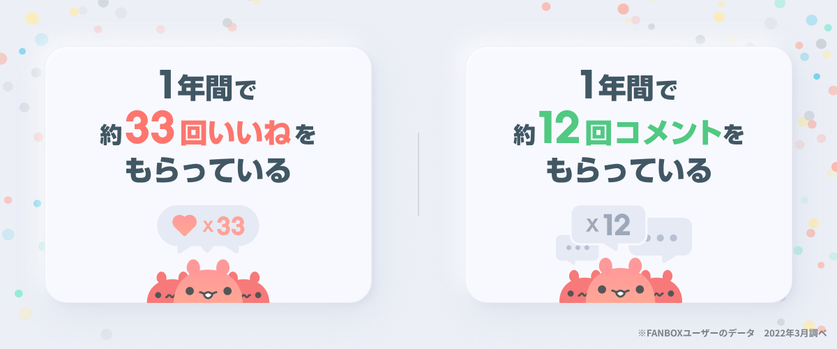 現在、pixivFANBOXを利用するクリエイター1人が1年のうちにファンから受け取る反応の数は、投稿へのいいねが約33件、コメントが約12件となっています。
