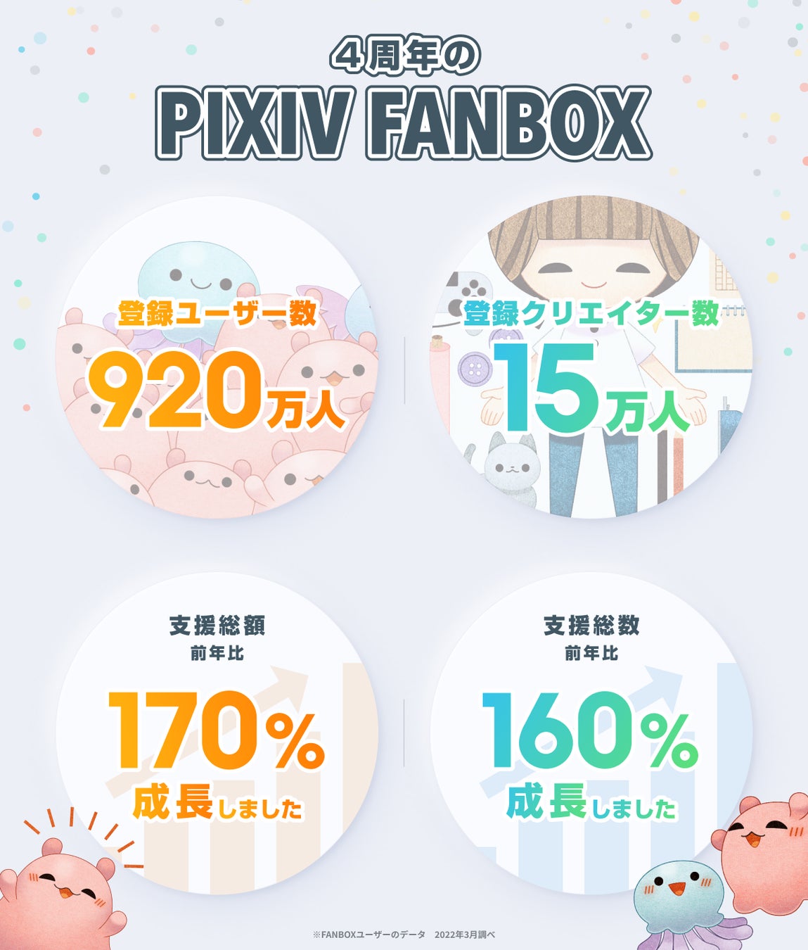pixivFANBOXとは、クリエイターの継続的な創作活動を応援するファンコミュニティです。クリエイターは、ファンから毎月支援を得ることができ、創作の裏話を支援者だけに公開したり、限られたファンとのコミュニケーションを楽しむことができます。2022年4月26日(火)に4周年を迎えました。