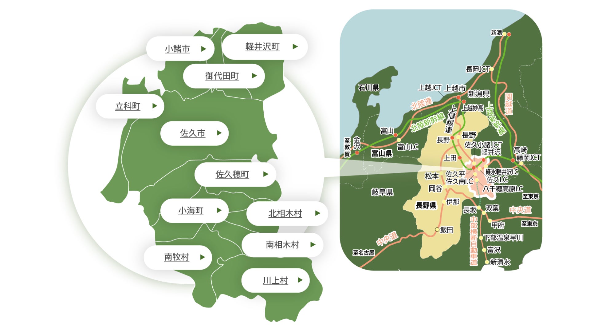 佐久地域は、国際親善文化観光都市である「軽井沢」をはじめ、野辺山高原、白樺高原など国内有数の高原観光地を有し、浅間山や八ヶ岳などの名山が連なる中、上信越高原国立公園や八ヶ岳中信高原国定公園などが四方を囲む、自然豊かな地域です。