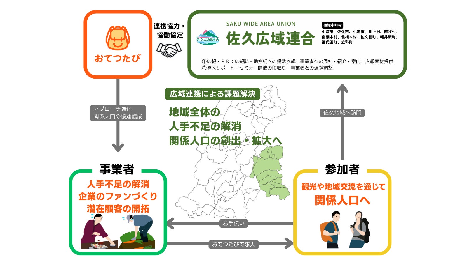 今回の協定締結により、単独自治体ではなく「広域連合」としてのスケールメリットを活かし、佐久地域内における事業者の利用拡大を図ります。これにより、季節的な人手不足の解消、さらには「おてつたび」を通じたファンづくり(関係人口の創出・拡大)に向け、広域的な課題解決を目指します。